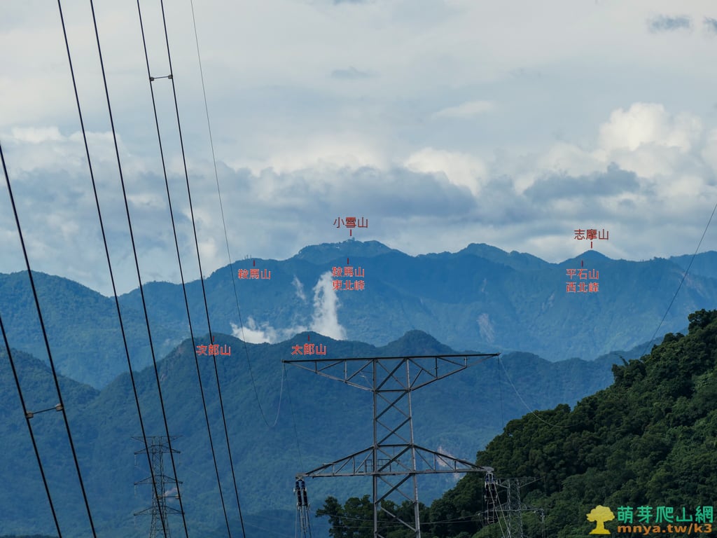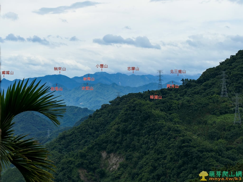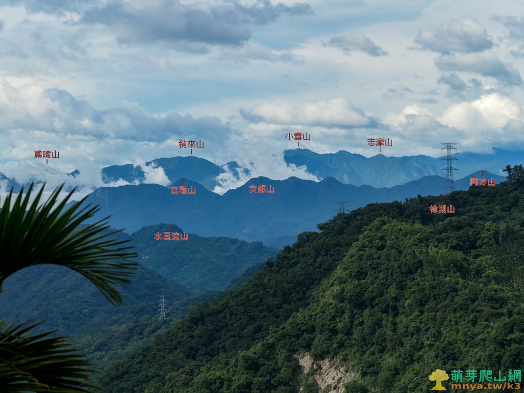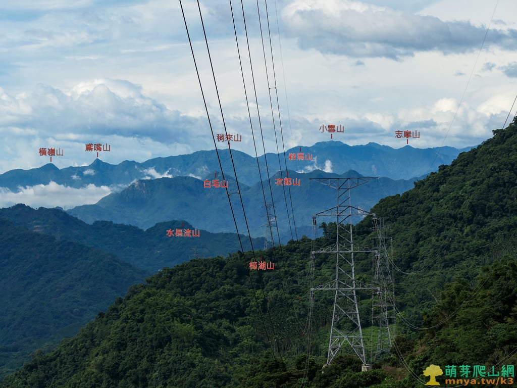 ▲往東北邊電塔延伸之山稜可見電塔(天輪-龍崎海線064、天輪-龍崎山線064)旁的樟湖山(508M),後方為北港溪以北的水長流山(730M),再向後為大甲溪南邊山稜,可見谷關七雄之一的白毛山(1522M)及向東的山峰次郎山(1504M),最遠可眺望大雪山林道沿線上的山巒,左至右依序可見橫嶺山(2024M)、鳶嘴山(2180M)、稍來山(2307M)、鞍馬山(2666M)、小雪山(2997M)、志摩山(3145M)。
