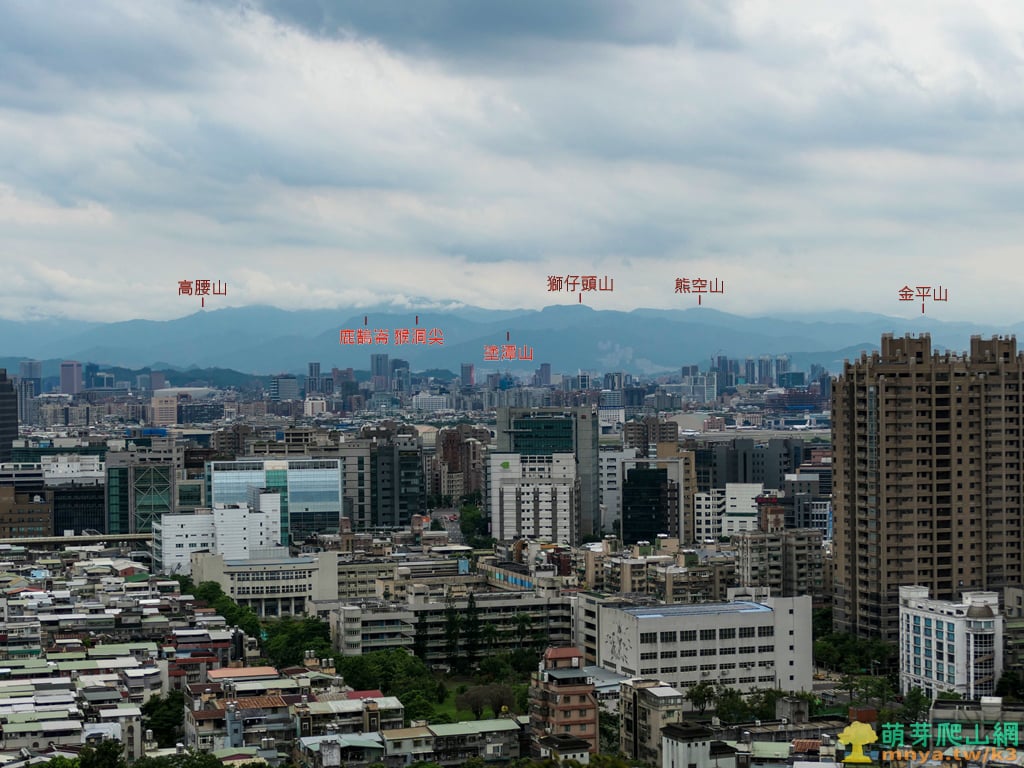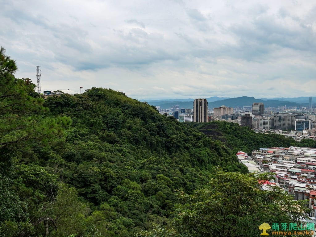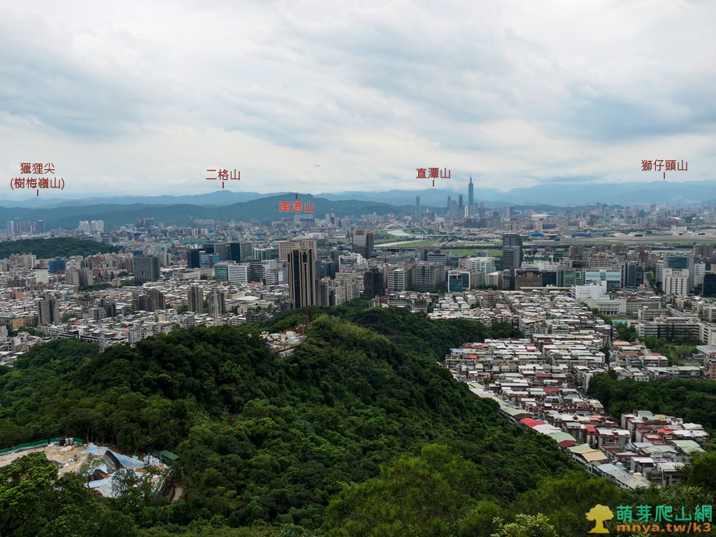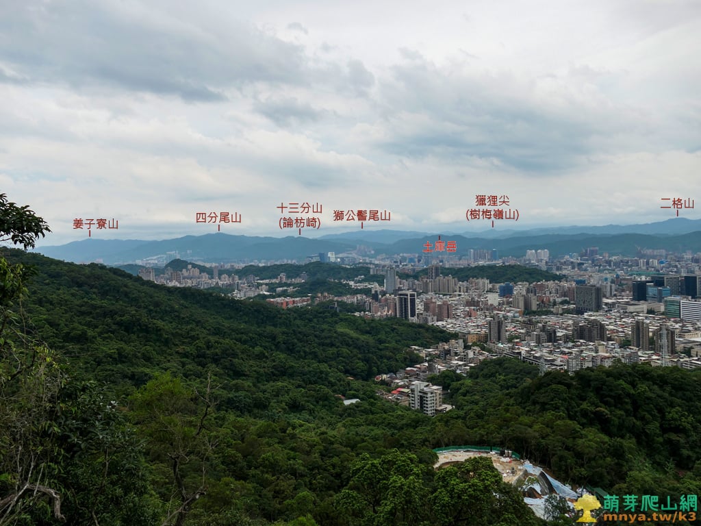 ▲重陽亭前方開闊的風景,往東南方向俯瞰內湖、南港、汐止等地,靠前能見土庫岳(389M)、十三分山(論枋崎;438M)、四分尾山(641M)至姜子寮山(729M)的稜線,由南港一路延伸至基隆市,遠眺位於台9線(北宜公路)附近的獅(司)公髻尾山(840M)、獵狸尖(樹梅嶺山;706M)、二格山(678M)等地。
