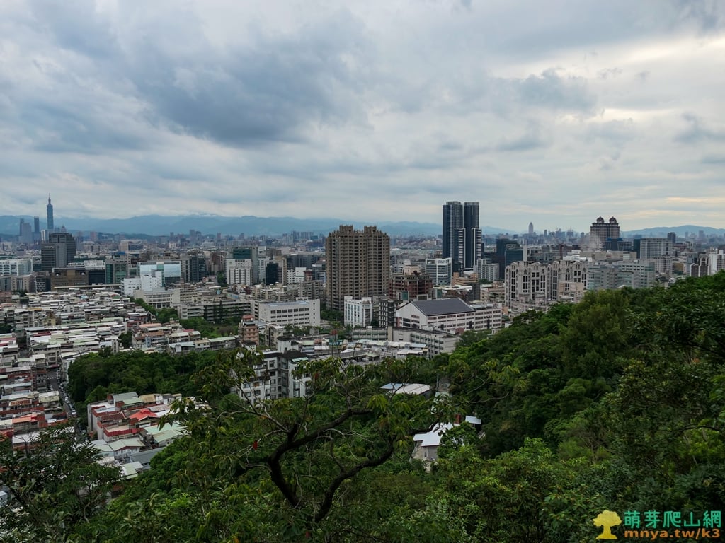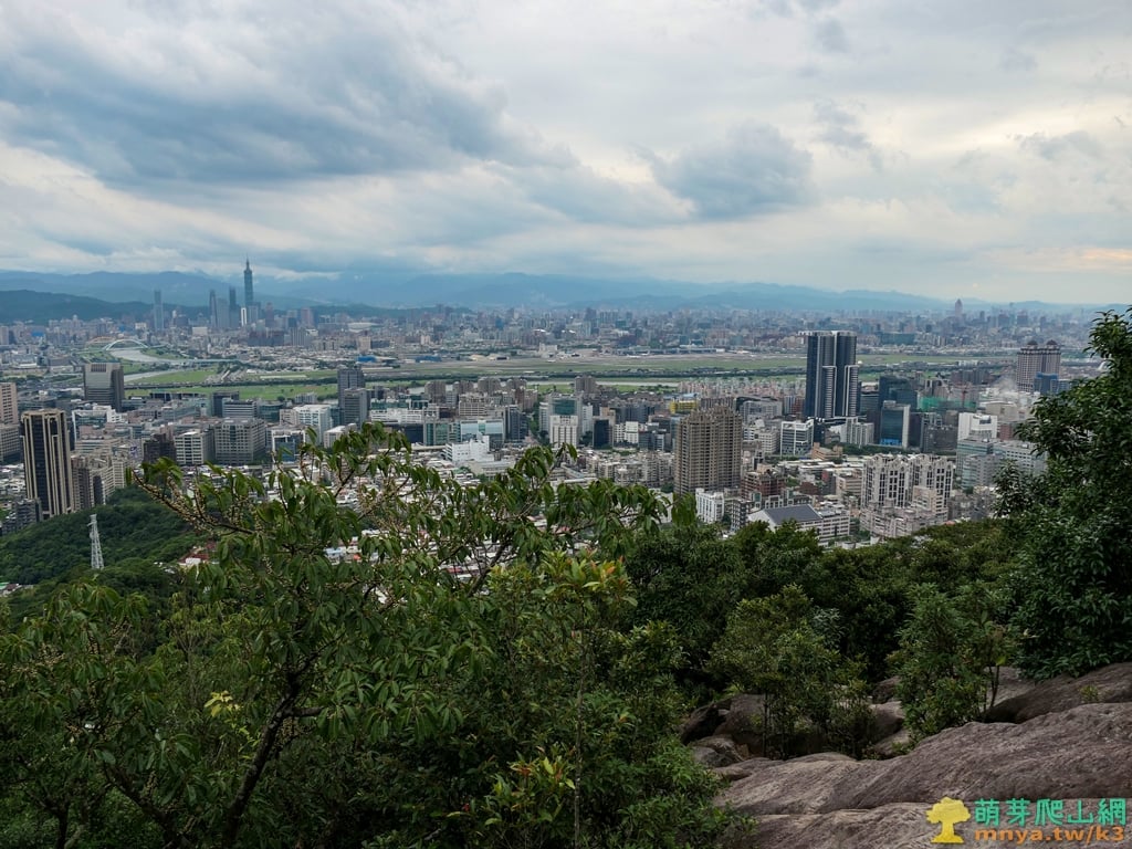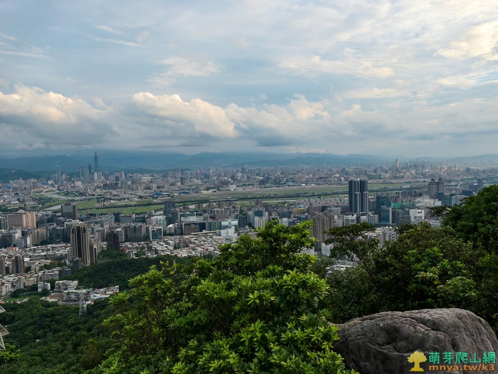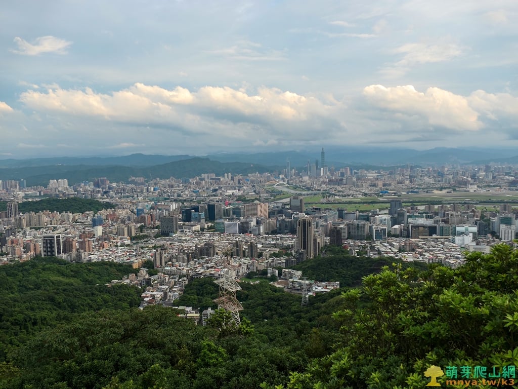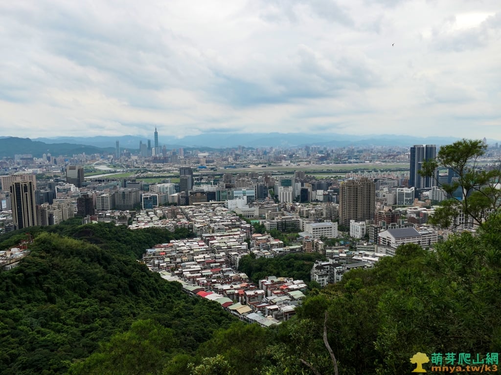 ▲往南俯瞰繁華的臺北盆地市區,山下為熱鬧的內湖地區與基隆河沿岸、松山機場,眺望南港山(374M)與台北101大樓。