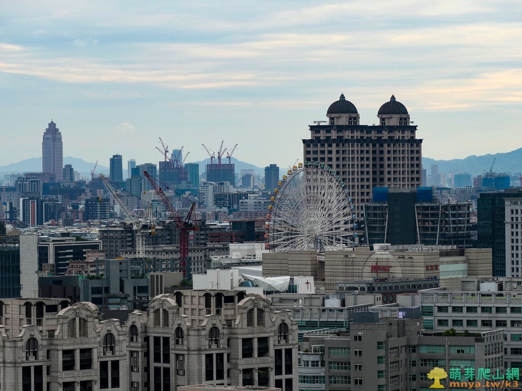 ▲拉近看美麗華摩天輪,左側遠方為石門山等地,中間為三峽鳶山稜線,往南視距能看得很遠。