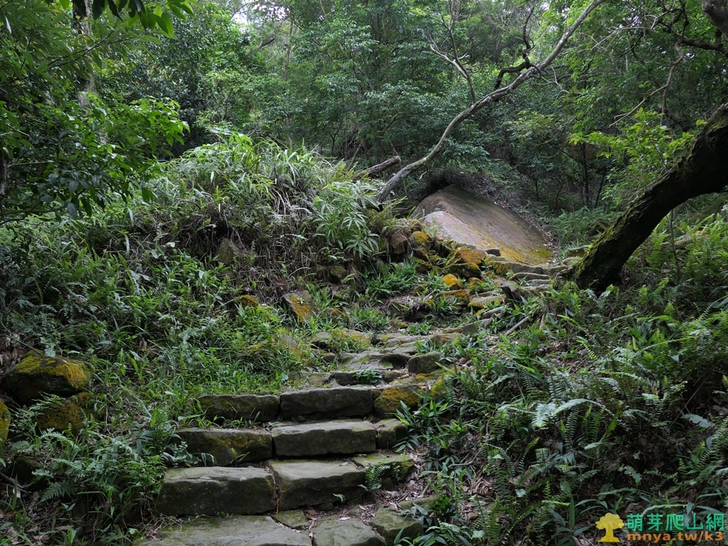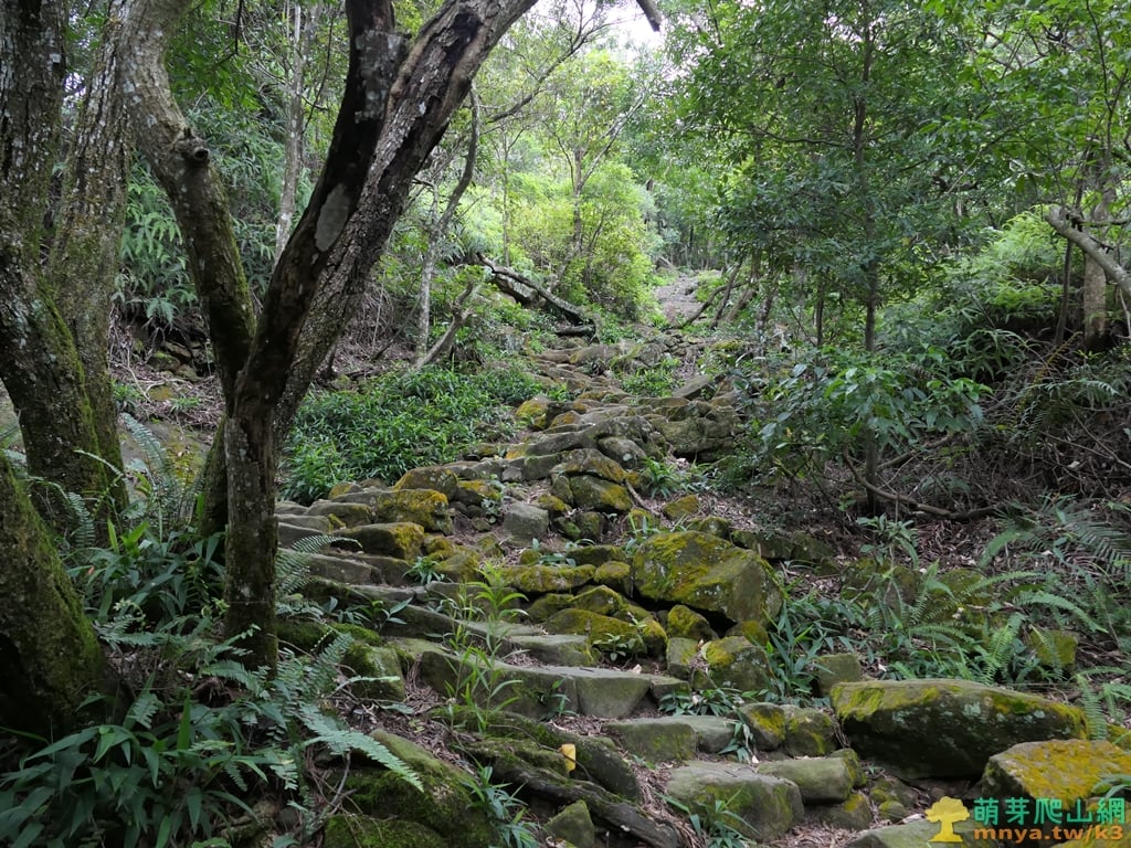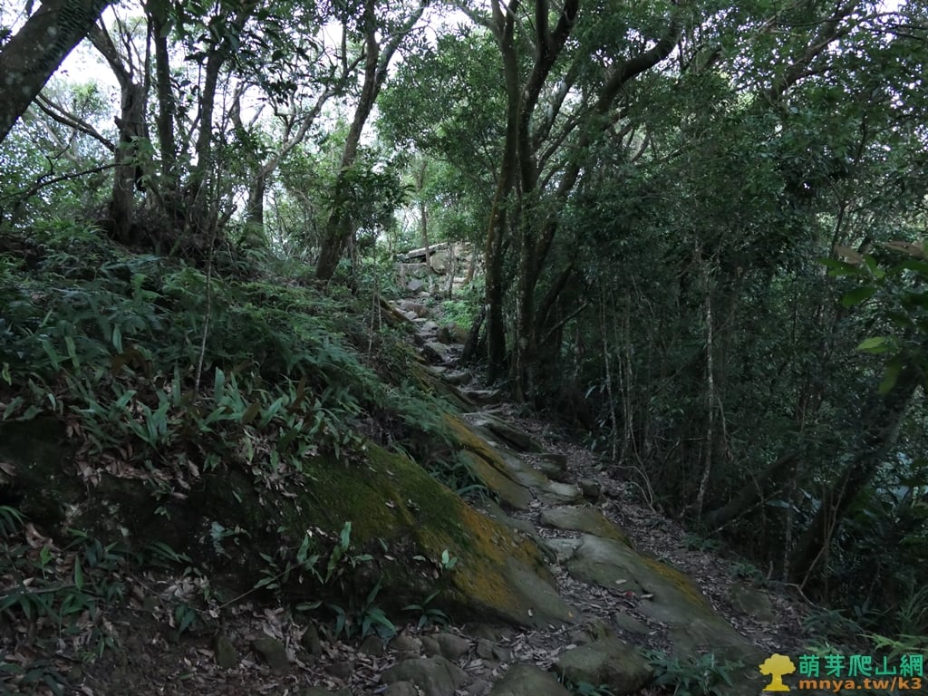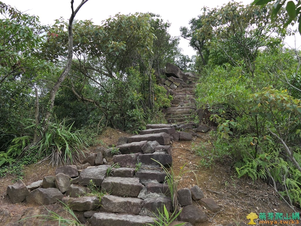 ▲順著石階步道沿山坡陡上,採石場路線要一路爬坡直上剪刀石山,爬升超過兩百公尺。