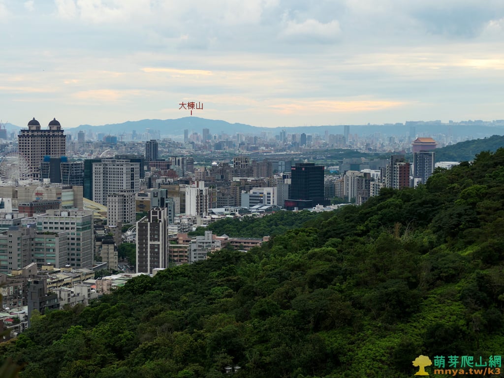 ▲往西南眺望台北盆地都市叢林,山下為內湖大直地區,可見美麗華摩天輪,右側遠眺林口台地邊緣的大棟山(405M)。