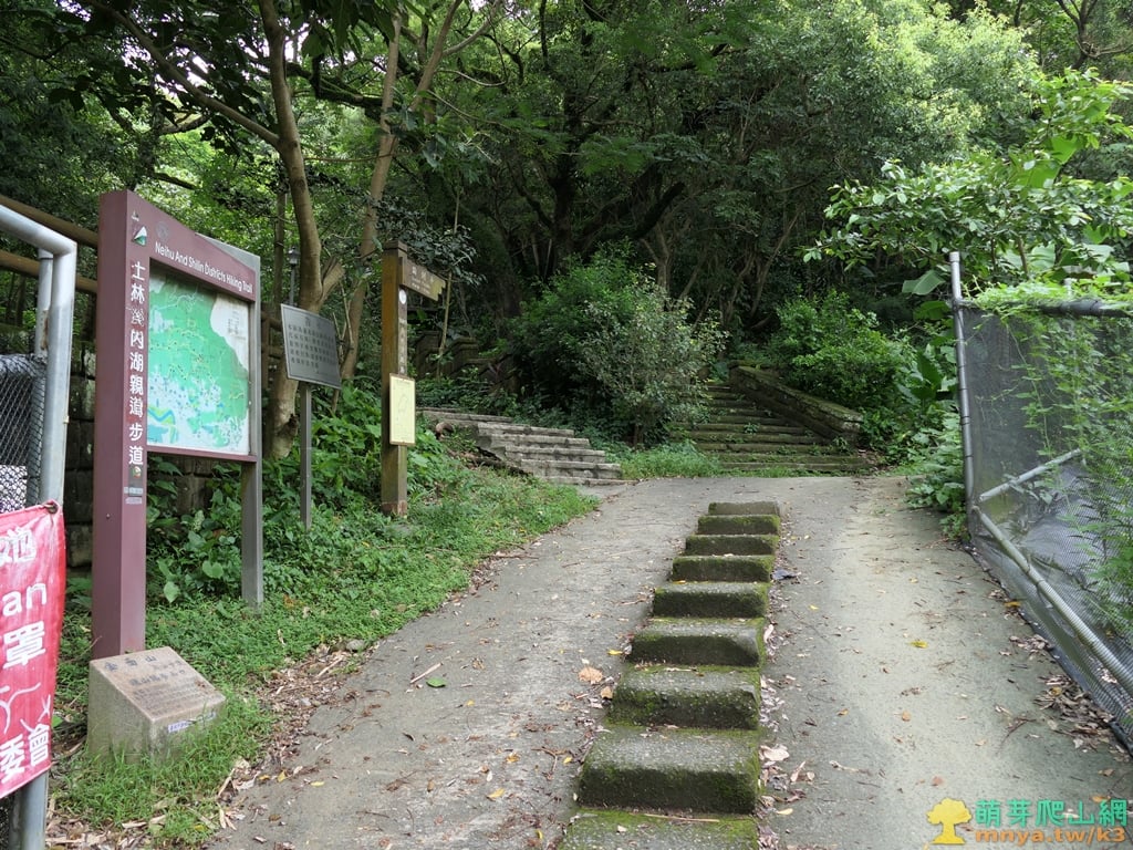 ▲18:41,陡下至鞍部岔路取右出環山路二段68巷,路口指標右往環山路二段68巷464M、18分;直往內湖路三段900M、28分;回往打印台720M、18分,右側步道邊有一面金面山常見植物之介紹牌。
