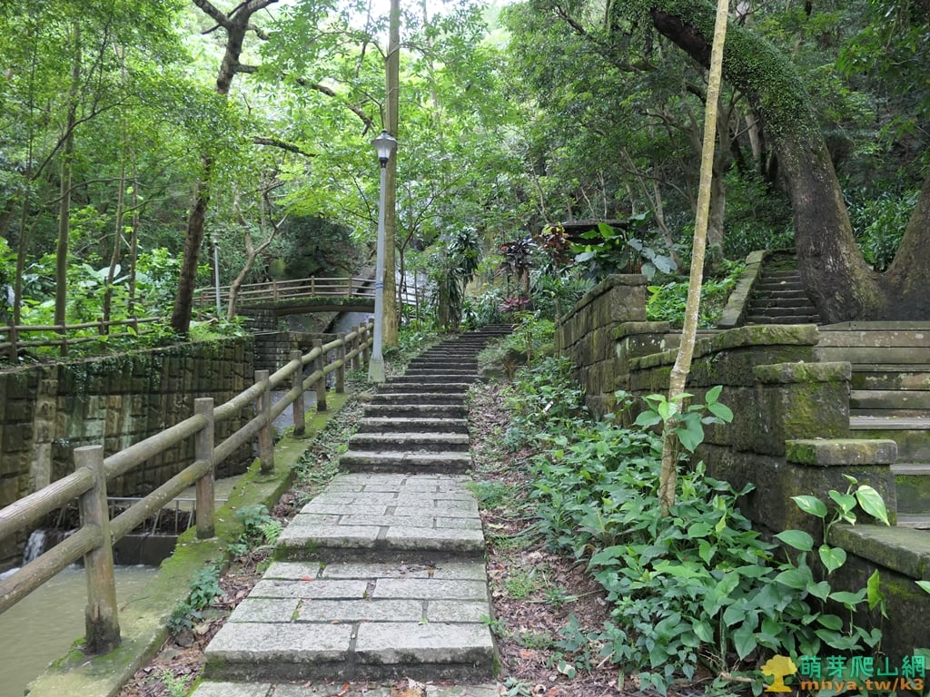 ▲沿溪溝畔平行之步道往上行,前方小橋前有一座涼亭,續行的步道則於涼亭之右側。