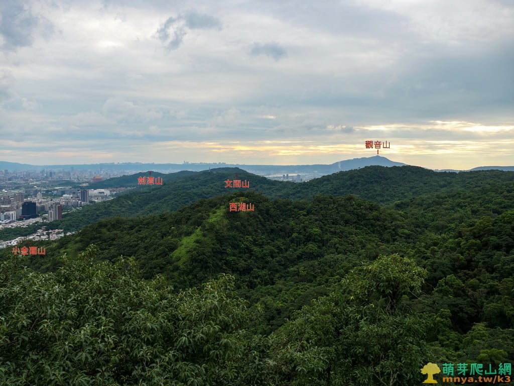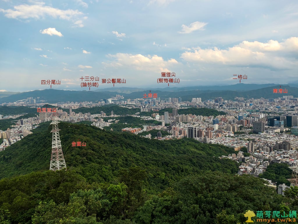 ▲俯瞰山下的電塔與金面山(181M),向前延伸能見大湖公園旁的白鷺鷥山(142M),城市對面能見四分尾山(641M)、十三分山(論枋崎;438M)、土庫岳(389M)之稜線,後一層山巒能見獅(司)公髻尾山(840M)、獵狸尖(樹梅嶺山;706M)、二格山(678M),右側可見南港山(374M)。