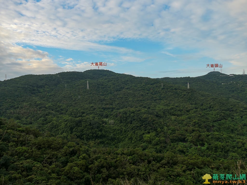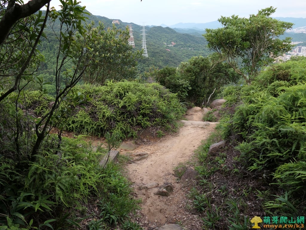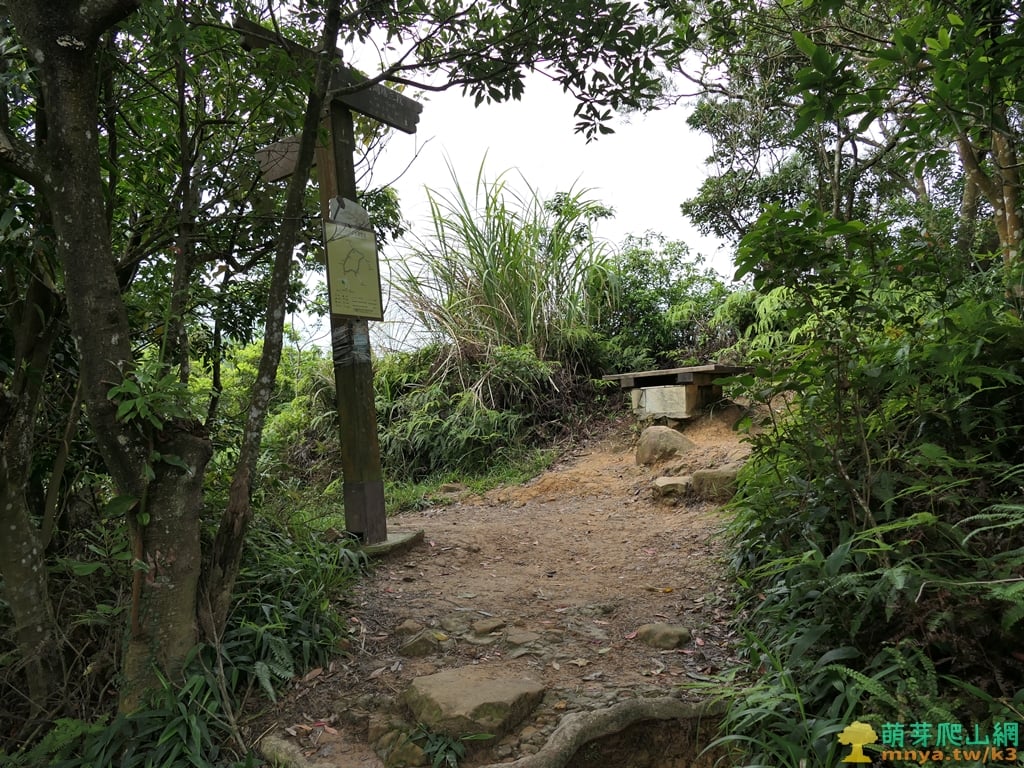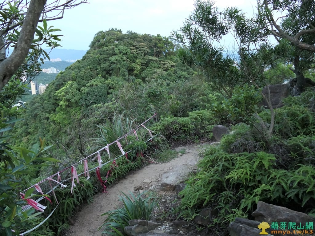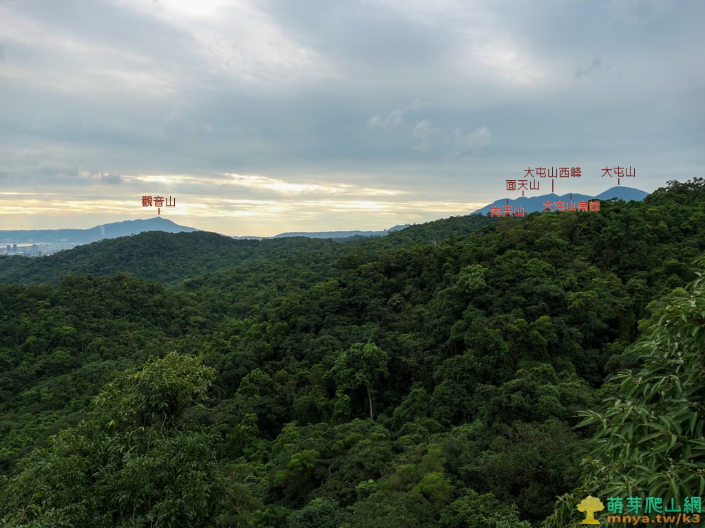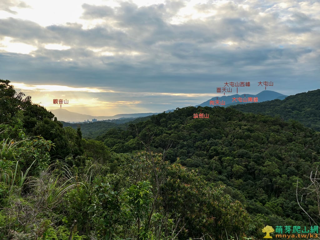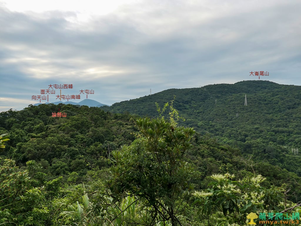 ▲岔路往左視野開口,西北邊可見待會的目標論劍山(266M),論劍山之後方可見向天山(946M)、面天山(977M)、大屯山西峰(983M)、大屯山南峰(959M)、大屯山(1092M),北邊則可見大崙尾山(451M)。