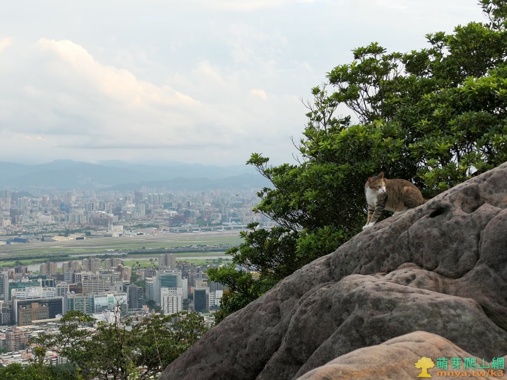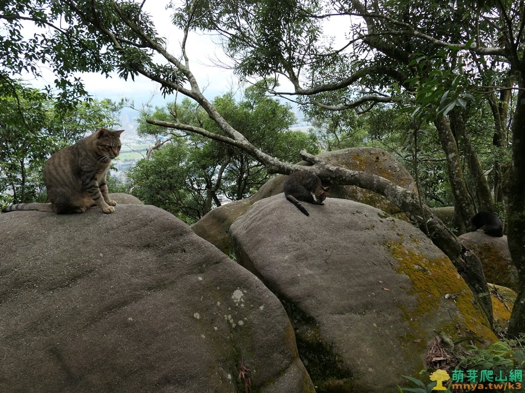 ▲上行爬坡趨緩前方已可見論劍亭,稜線大石上靜靜躺著一隻貓,仔細一看後方石塊上竟還坐著好幾隻貓。