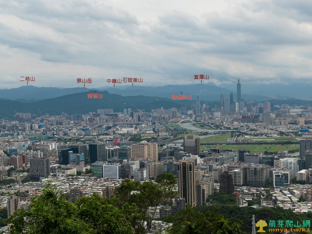 ▲論劍亭第二層平台展望,俯瞰台北內湖、松山、信義、南港等地,遠眺台北101大樓即其左後方的南港山(374M),往南後一層山稜可見二格山(678M)、猴山岳(551M)至待老坑山(382M)之稜線,遠眺北勢溪(翡翠水庫)北邊的中嶺山(626M)、石碇後山(669M)至直潭山(728M)之稜線,更遠的山巒則在雲霧之中。