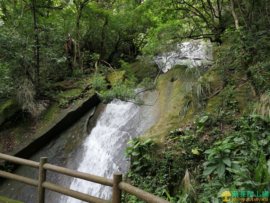 ▲小橋跨越溪溝,後方一片石壁瀑布,橋邊有一面「內湖清代採石場」的介紹牌。