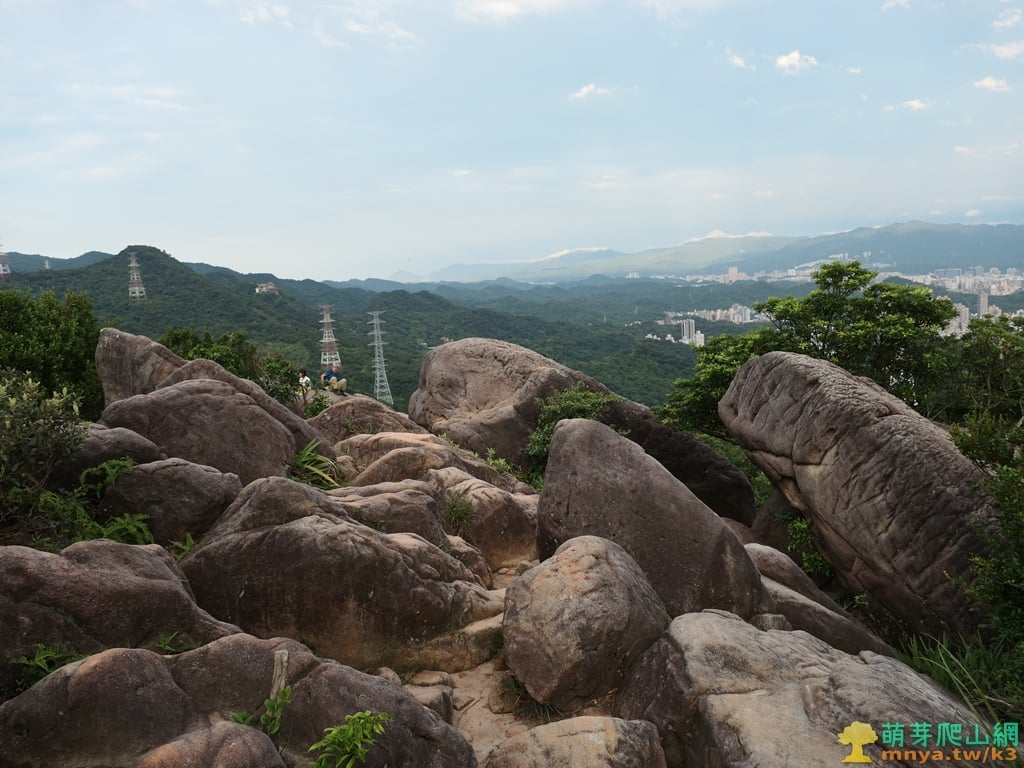 ▲站上剪刀石山稜線大石之上,往西北回望論劍山(266M),遠眺位於淡水河兩岸的觀音山(616M)與向天山(946M)、面天山(977M)、大屯山西峰(983M)、大屯山南峰(959M)、大屯山(1092M)。