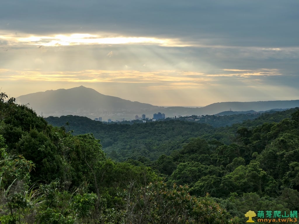 ▲拉近眺望淡水河口與觀音山(616M),日落餘暉從雲層中透出。