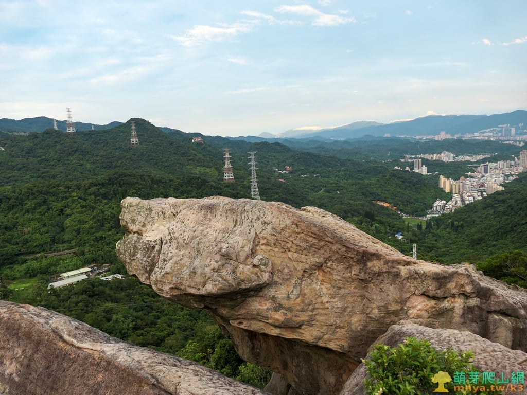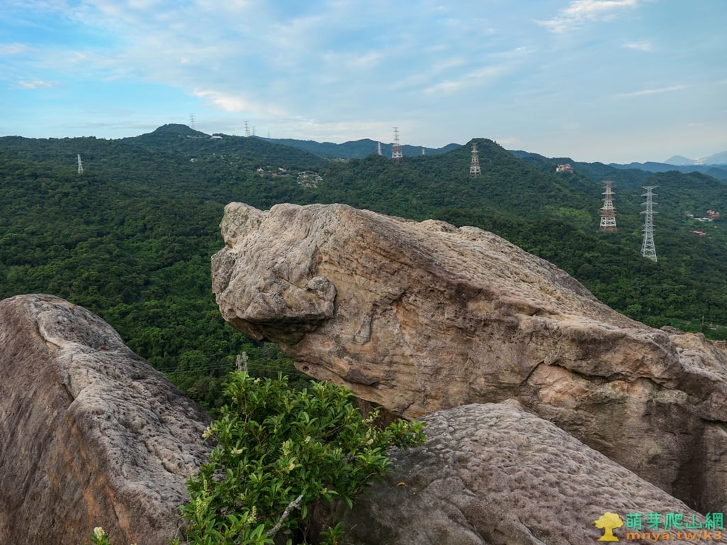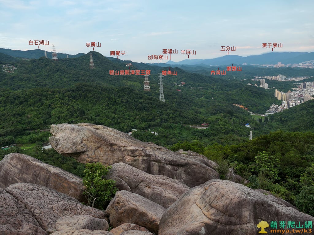 ▲來到岩場的稍低處,下方突起騰空的岩石,與周遭的岩石形成如剪刀般的形狀,因此被稱為「剪刀石」,站在大石上有著近乎三百六十的展望,眺望對面的碧山巖開漳聖王廟與周邊的內湖三尖:忠勇山(327M)、圓覺尖(292M)、鯉魚山(222M),左側可見白石湖山(458M)、右側可見位於基隆七堵交界的刣狗寮山(271M),遠處可見位於台北內湖、新北汐止交界的內溝山(137M),與汐止交流道附近的五堵獅頭山(174M),遠處可眺望九份地區的基隆山(587M)、半屏山(705M),和五分山(757M)、姜子寮山(729M)連稜。