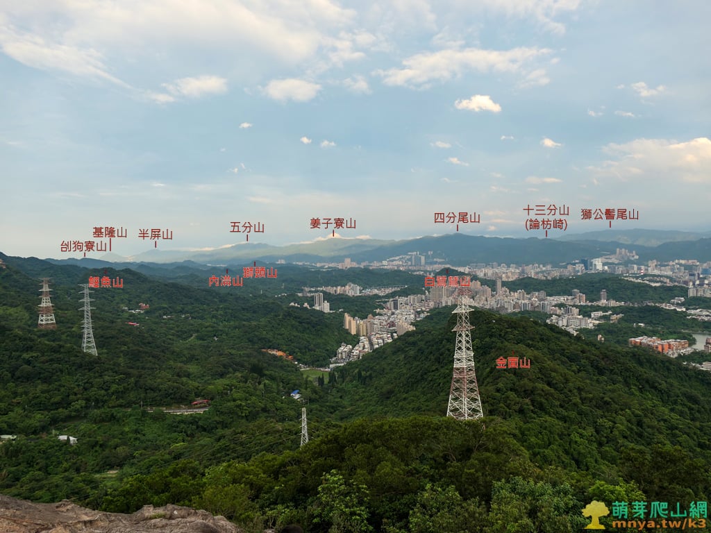 ▲剪刀石山岩場向東大景,俯瞰連稜向下延伸的金面山(181M),向前能見內湖大湖公園與白鷺鷥山(142M),左側能見內湖三尖中的鯉魚山(222M),中間的淺山連峰中可見刣狗寮山(271M)、內溝山(137M)、五堵獅頭山(174M),最遠能見九份地區的基隆山(587M)、半屏山(705M),向前能見五分山(757M)、姜子寮山(729M)之稜線一路延伸至四分尾山(641M)、十三分山(論枋崎;438M),東南邊最遠可見獅(司)公髻尾山(840M)。