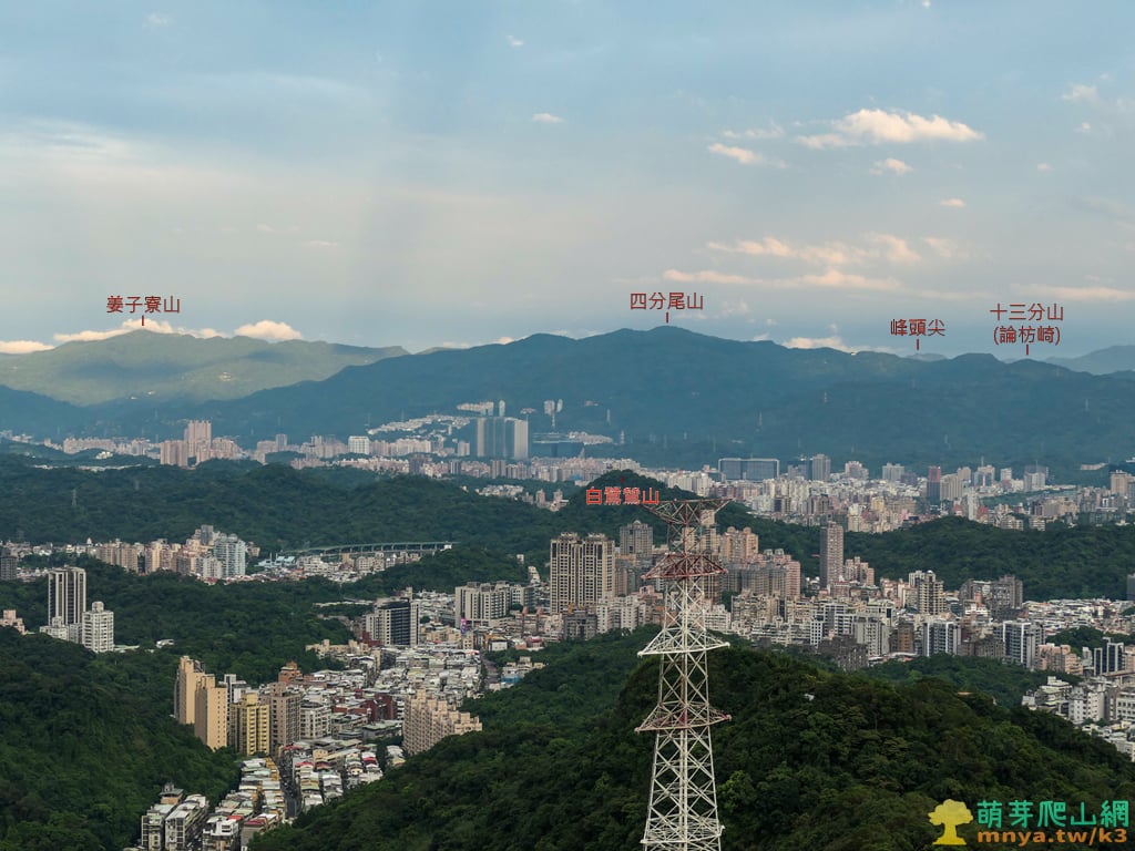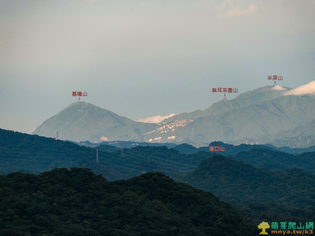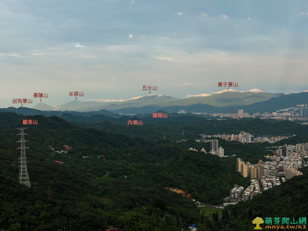 ▲往東拉近眺望五分山(757M)至姜子寮山(729M)之稜線,遠眺基隆山(587M)、半屏山(705M),靠近一側的層層山巒能見鯉魚山(222M)、刣狗寮山(271M)、內溝山(137M)、五堵獅頭山(174M),右側能見大湖公園旁的捷運文湖線。