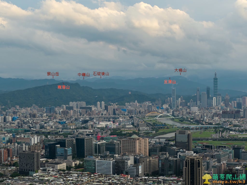 ▲往南拉近眺望南港山(374M)與台北101大樓,從近至遠可見跨越基隆河上的國道一號高架、民權大橋、麥帥二橋、麥帥一橋,南港山之後可見猴山岳(551M),再往後能見中嶺山(626M)、石碇後山(669M)至直潭山(728M)之連稜,直潭山之右後方則可見位於新北烏來的大桶山(916M)。