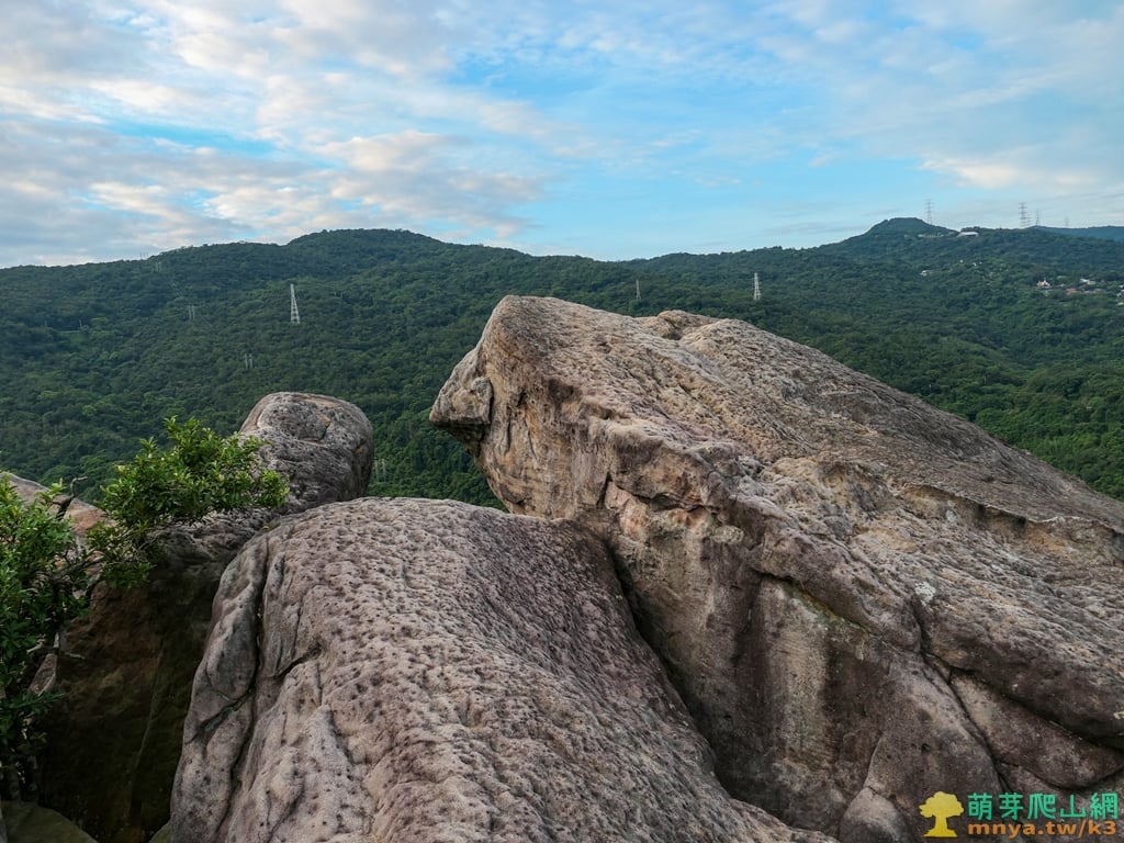 ▲剪刀石與後方的大崙尾山(451M)、大崙頭山(472M)稜線,剪刀石山展望絕佳,山稜上的涼風舒適令人不想下山,即使已近日落時間仍有不少人坐在大石上看風景休息。