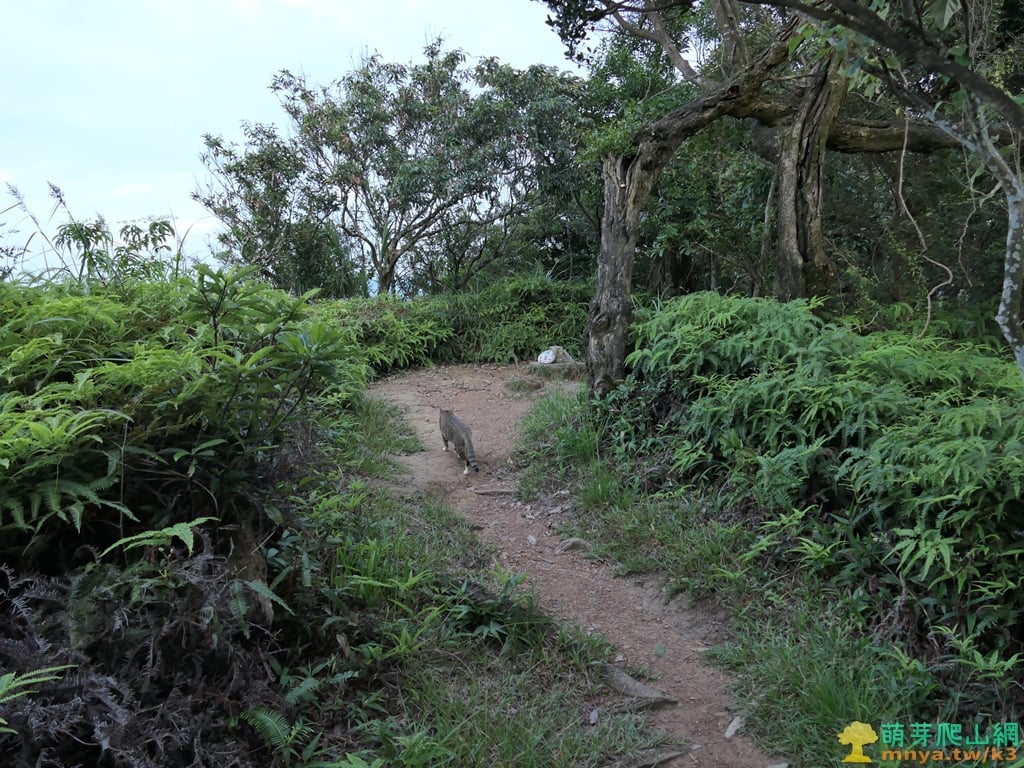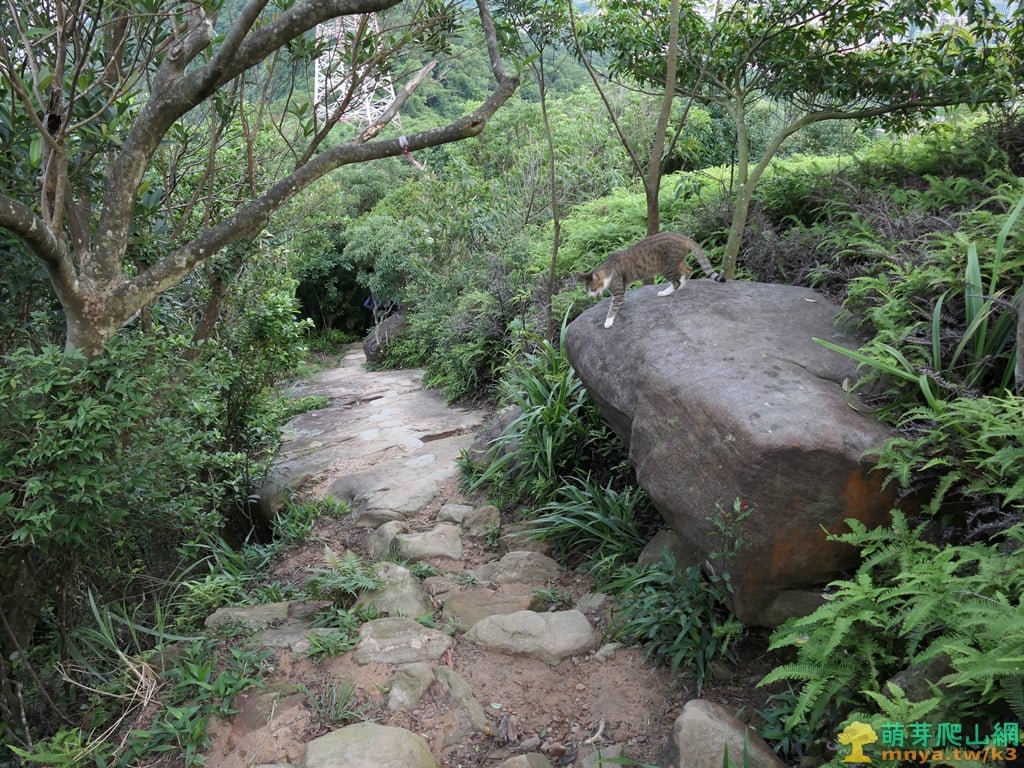 ▲步道陡下仍有一段段岩石路,剪刀石山上的貓跟著其他山友下山,十分靈活四隻腳跑得比兩隻腳快。