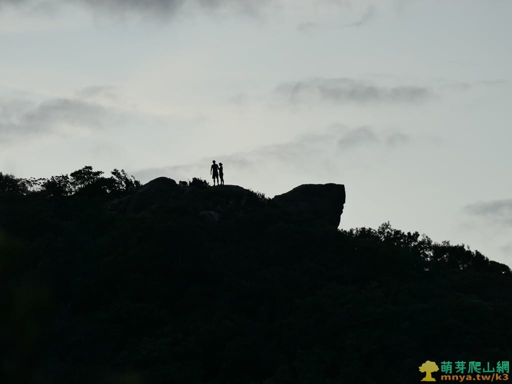 ▲從金面山回望剪刀石山,大石之上可以見到人影。