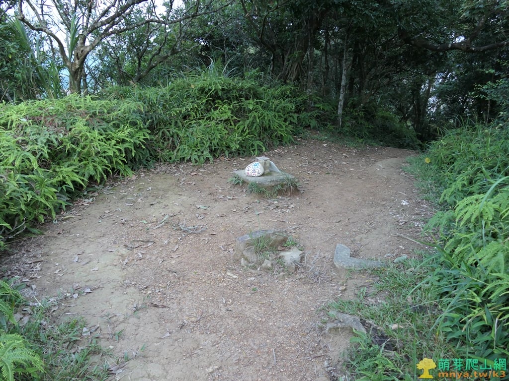 ▲經倒木後抵達論劍山頂,基石位於步道左側。