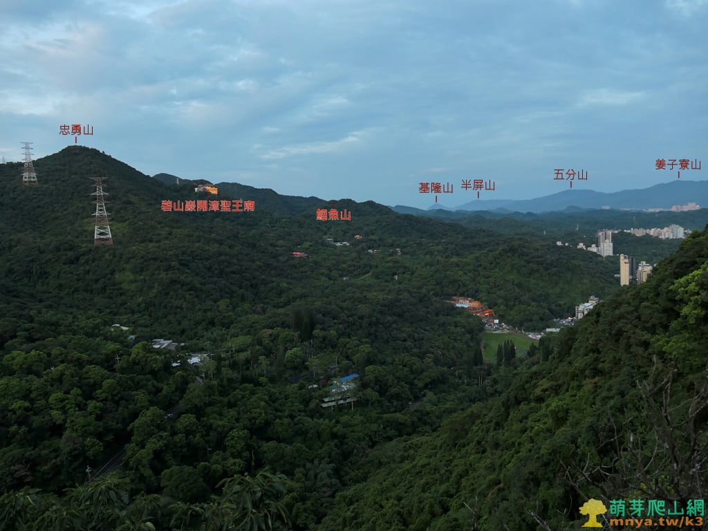 ▲左側山崖邊俯瞰山下的內湖路三段與對面的碧山巖開漳聖王廟、忠勇山(327M)、鯉魚山(222M),山谷下可見內湖金瑞治水園區、台北護國延平宮(鄭成功廟),遠眺基隆山(587M)、半屏山(705M)與五分山(757M)至姜子寮山(729M)之稜線。