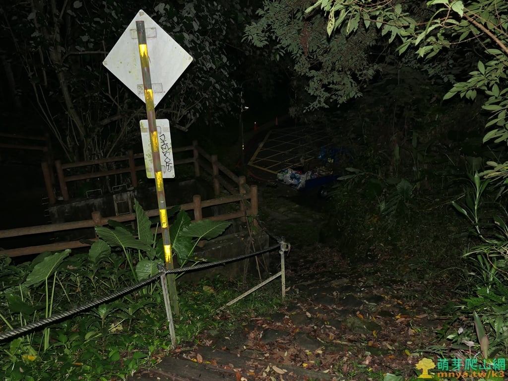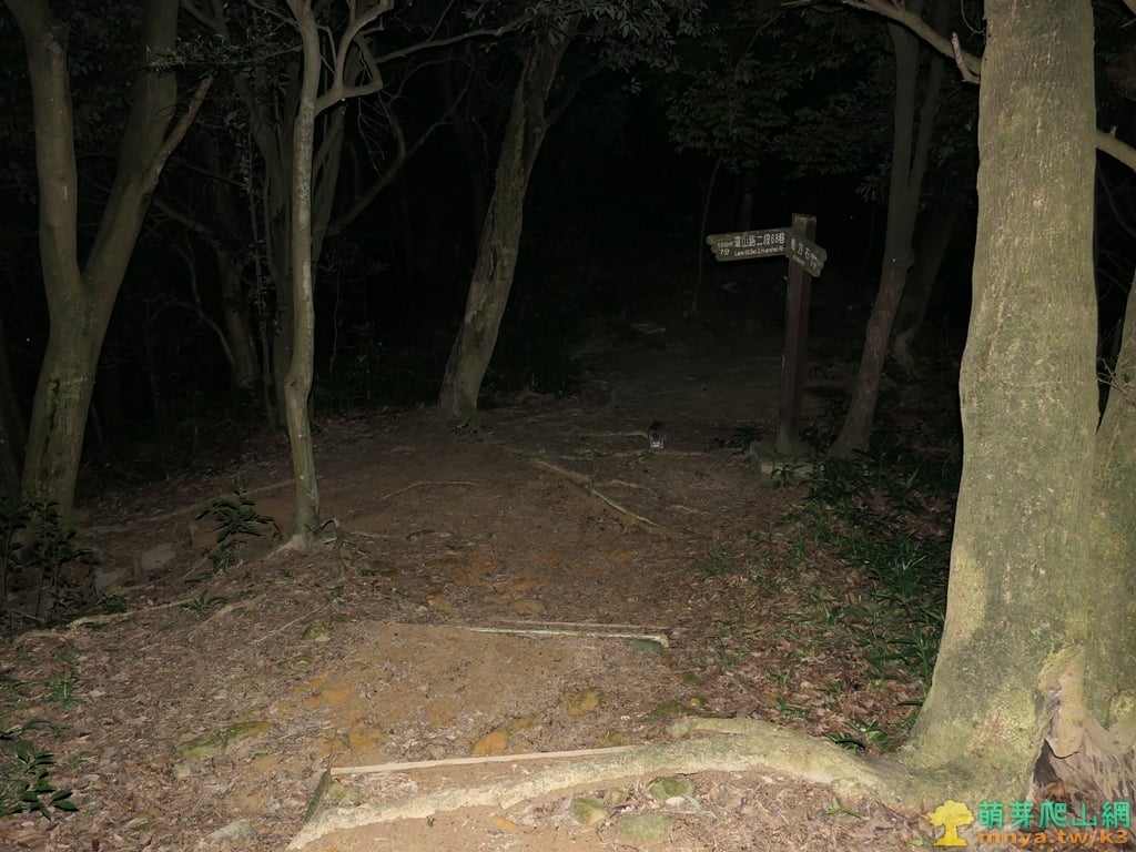 ▲18:44,沿山腰邊步道行一小段路再遇岔路取右下,路口指標右下往環山路二段68巷375M、15分;回往剪刀石800M、20分,左上可接回稜線上的金面山步道,最後一段下山路摸黑拿燈。