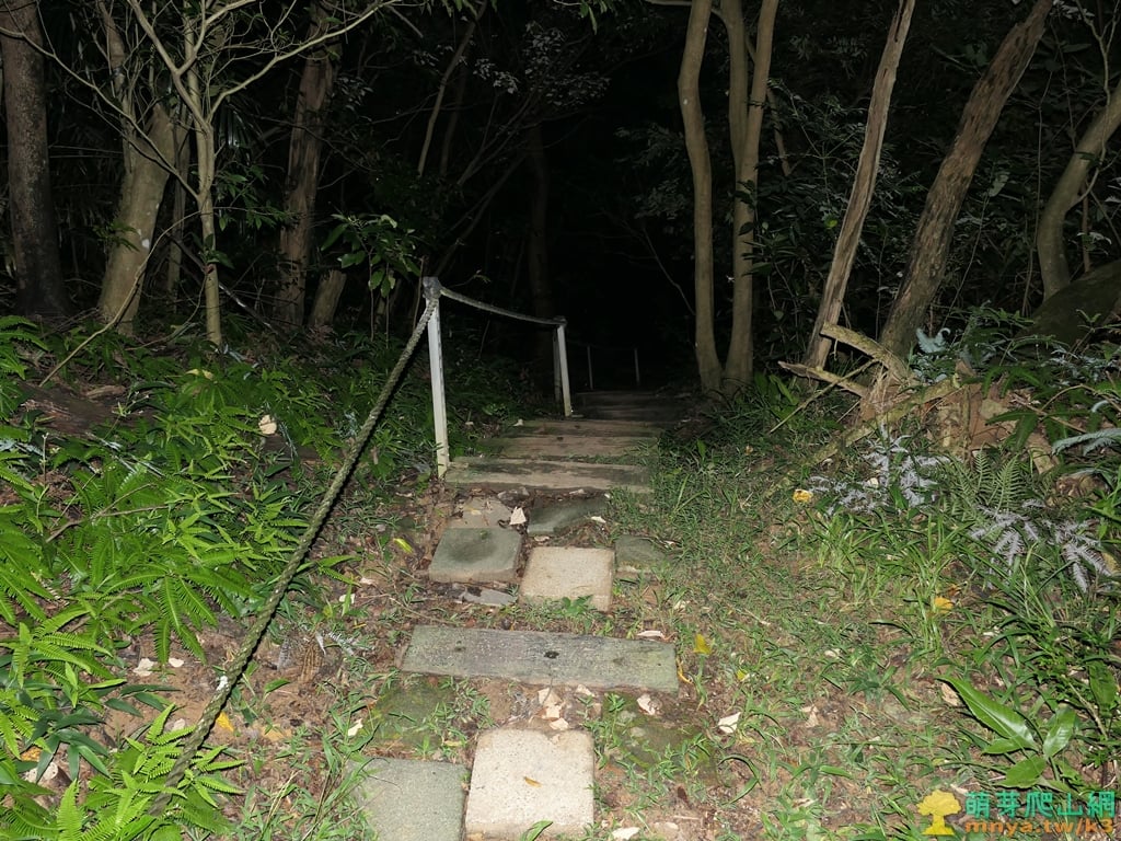 ▲最後一段木棧步道下坡,山下已能見社區燈光。