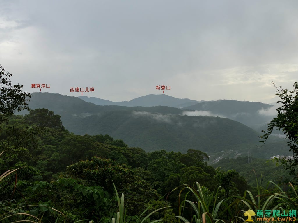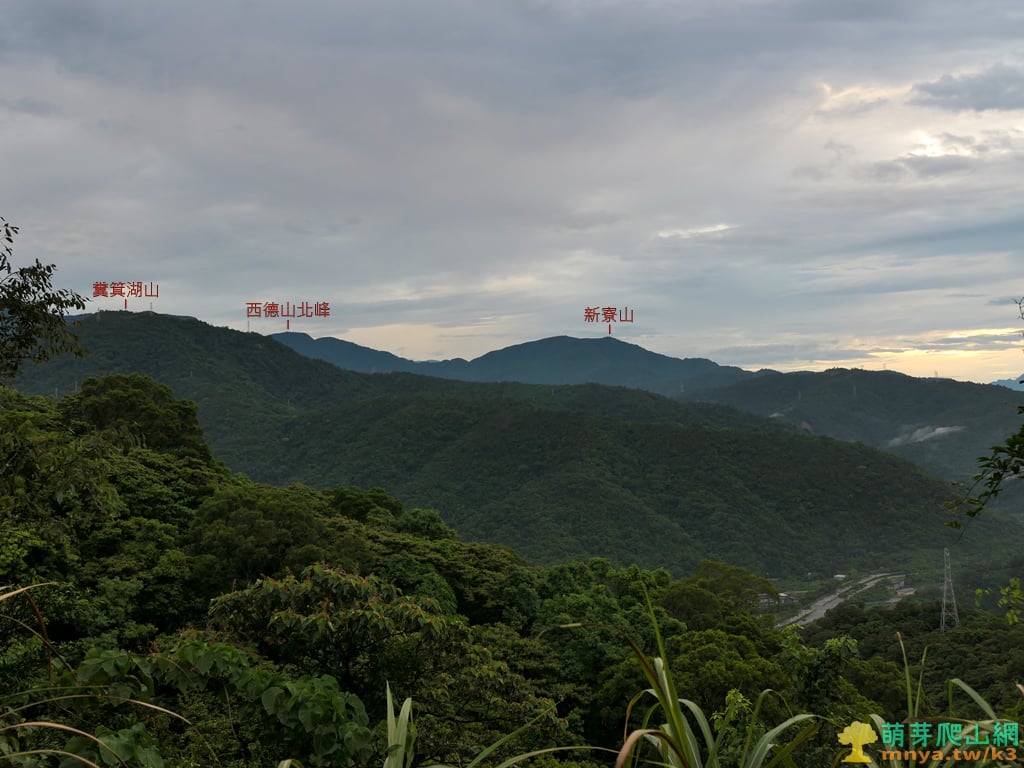 ▲往國道五號蘇澳端、蜡藝蜡筆城堡、龍德工業區方向眺望,遠方左側靠前能見位於雙連埤附近的三針後山(815M),左後方最遠能見烏來三姑中的波露山(1418M)、露門山(1461M),而雪山山脈主稜上由南向北依序可見:西阿玉山(1459M)、阿玉山(1420M)、中阿玉山(1283M)、大礁溪山(1161M)、小礁溪山(1147M),其中阿玉山(亦為烏來三姑之一)和大礁溪山皆為蘭陽五大名山。