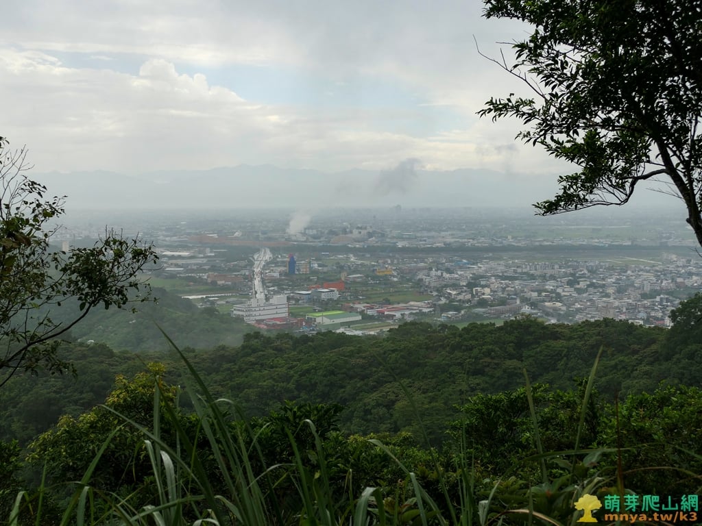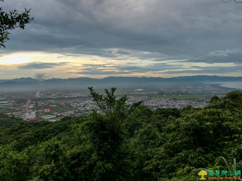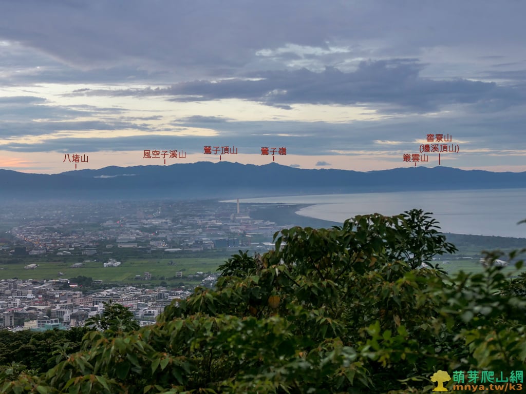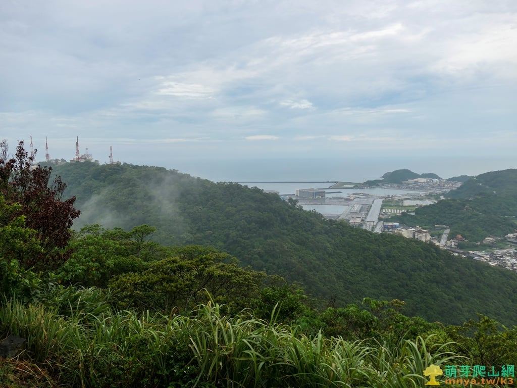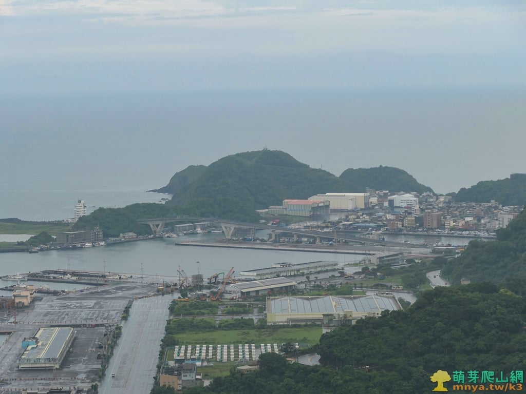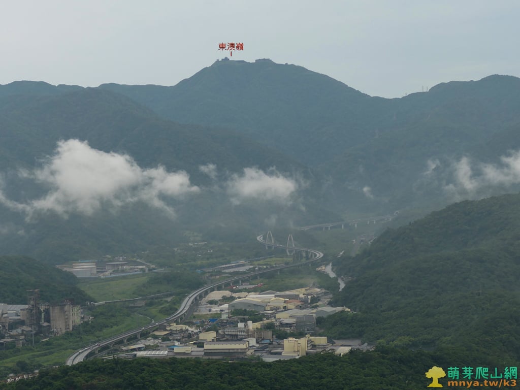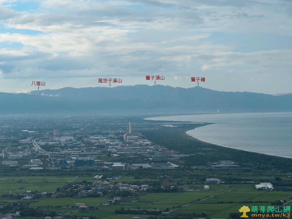 ▲往北眺望蘭陽平原海岸線,可見濱海的台2線與利澤焚化廠,海岸線中突起部分為蘭陽溪出海口,遠山對映著北宜公路以北的八堵山(853M)、風空子溪山(908M)、鶯子頂山(1001M)、鶯子嶺(943M)連稜山峰。