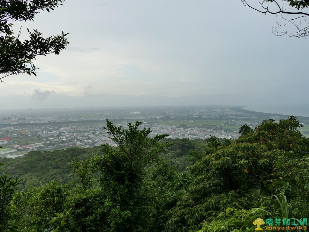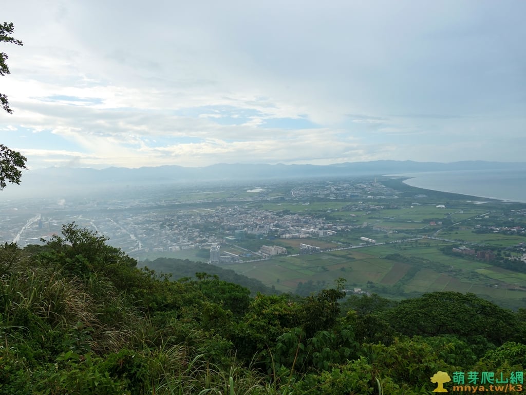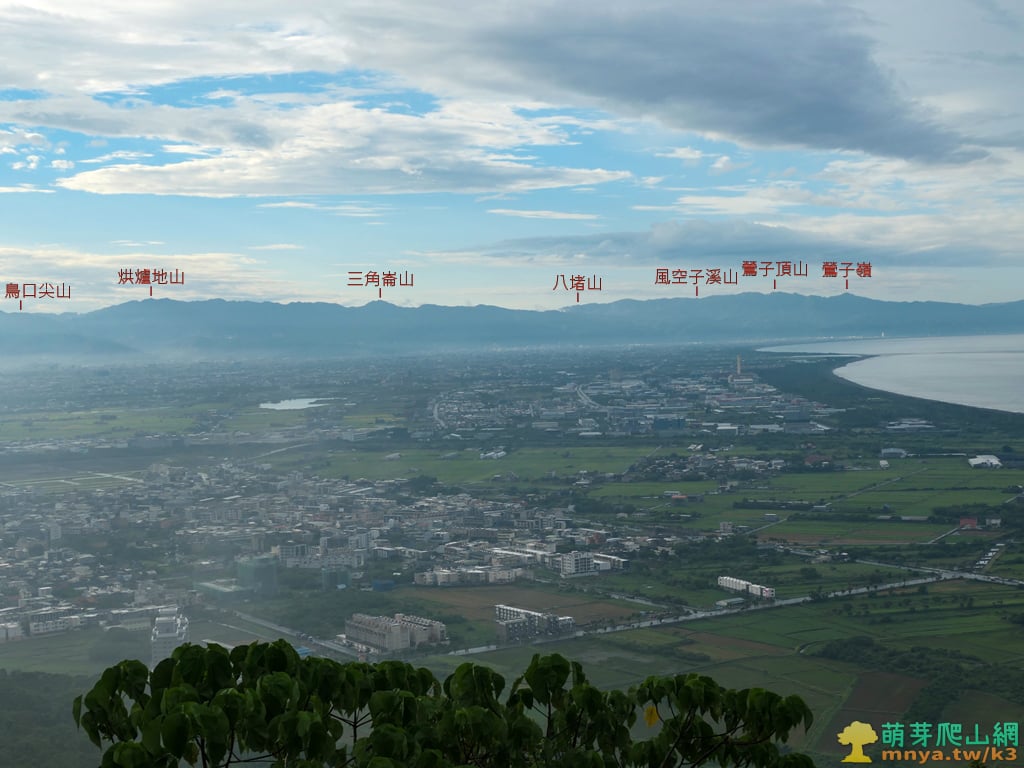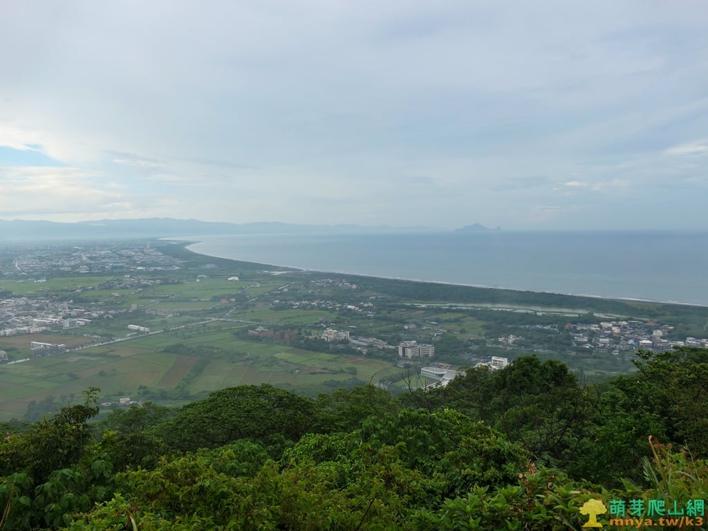 ▲往北眺望蘭陽平原及海岸線,平原中能見位於冬山河南邊的五十二甲溼地,左側最遠能見位於桶後溪北邊的鳥口尖山(1044M),圖中遠眺位於雪山山脈主稜上的烘爐地山(1167M)、三角崙山(1029M),及北宜公路以北的八堵山(853M)、風空子溪山(908M)、鶯子頂山(1001M)、鶯子嶺(943M)連稜山峰,其中烘爐地山、三角崙山、鶯子嶺為蘭陽五大名山,從這個角度能將蘭陽五大名山盡收眼底。