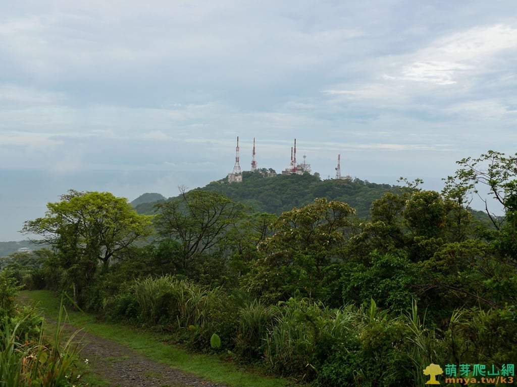 ▲桌椅平台處望向續行下山的土石路,可一路通往東邊的七星嶺(229M),可見山頂上的多座電視轉播站,其中二等內補023基石位於華視轉播站內,2006年時曾造訪過。