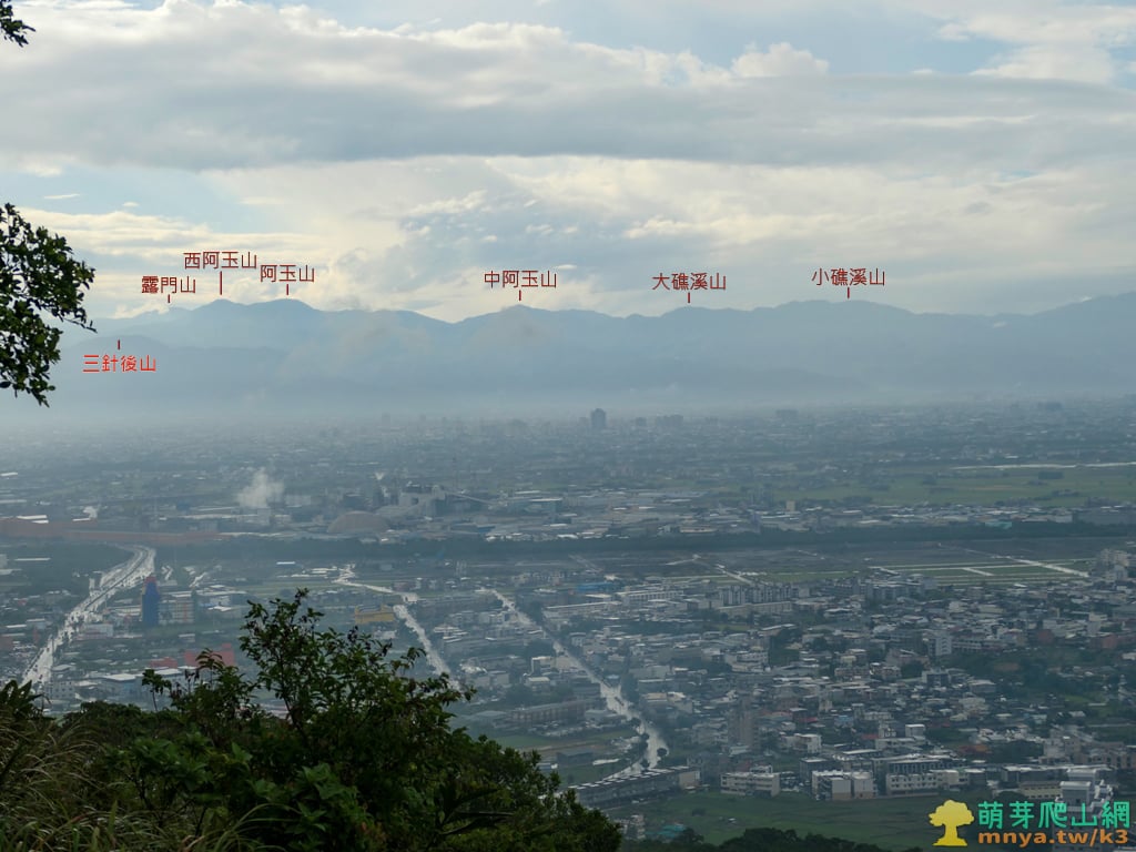 ▲往西北眺望蘭陽平原上的國道五號蘇澳端與羅東市區方向,遠眺位於雙連埤附近的三針後山(815M),與位在雪山山脈主稜上的西阿玉山(1459M)、阿玉山(1420M)、中阿玉山(1283M)、大礁溪山(1161M)、小礁溪山(1147M),阿玉山之左後方能見烏來三姑之一的露門山(1461M),其中阿玉山和大礁溪山皆為蘭陽五大名山。
