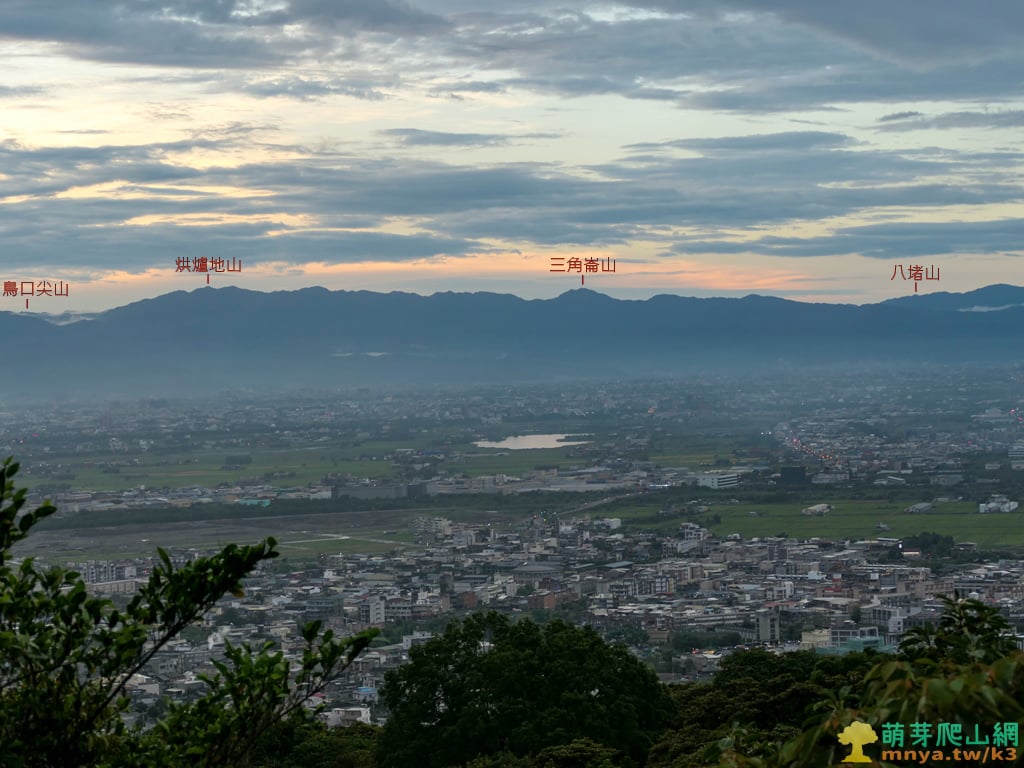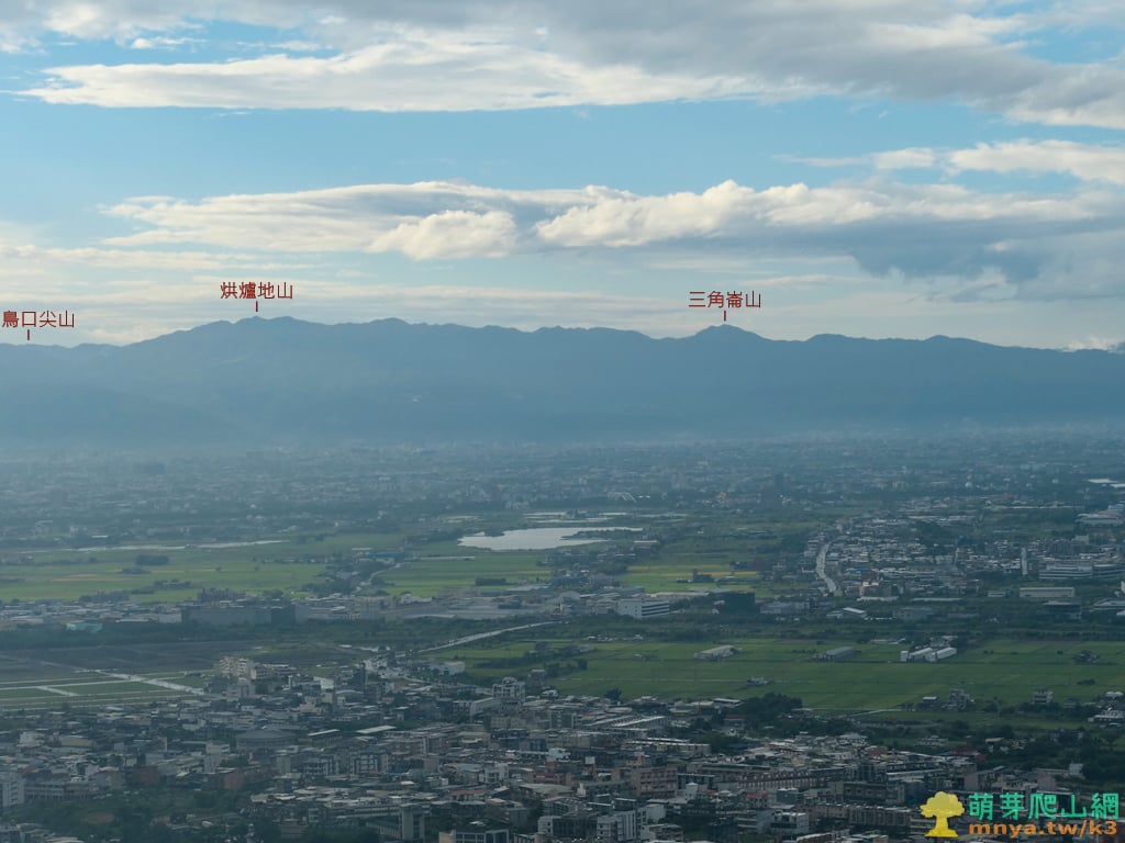 ▲拉近眺望蘭陽平原上,位於冬山河南邊的五十二甲溼地,遠山對映著蘭陽五大名山之中的兩座:烘爐地山(1167M)、三角崙山(1029M),左側最遠能見桶後溪北邊的鳥口尖山(1044M)。