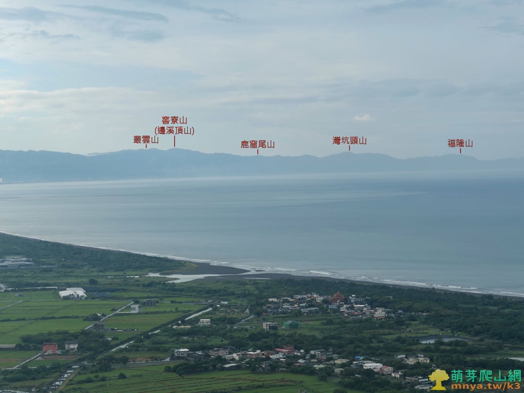▲往北眺望蘭陽平原東側濱海段,海岸線中突起部分為蘭陽溪出海口,遠山對映著北宜公路以北的八堵山(853M)、風空子溪山(908M)、鶯子頂山(1001M)、鶯子嶺(943M)連稜山峰,再向北為內大溪產業道路附近的叢雲山(712M)、窖寮山(溪邊頂山;736M)。
