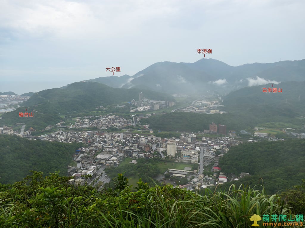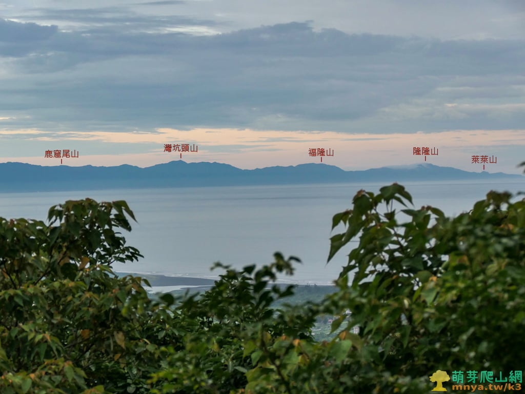 ▲往北俯瞰樹林缺口中可見新城溪出海口,海對面為雪山山脈往三貂角延伸之山稜,自南向北可見:鹿窟尾山(551M)、灣坑頭山(616M)、福隆山(473M)、隆隆山(432M)、萊萊山(208M)。