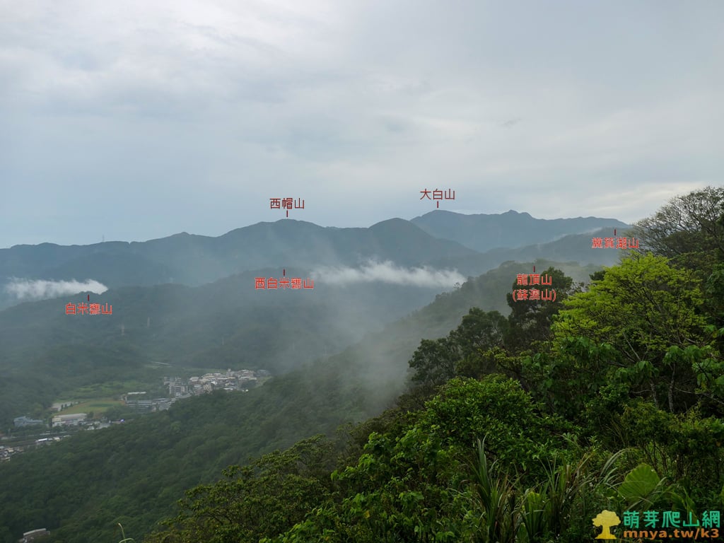 ▲往西南俯瞰蘇澳聖湖地區,向西能見待會要去的龍頂山(蘇澳山;244M),聖湖對面山稜可見白米甕山(200M)、西白米甕山(312M),龍頂山(蘇澳山)後方可見糞箕湖山(471M),遠處主稜脊上可見台泥石礦場旁的西帽山(960M)與大白山(1369M)。