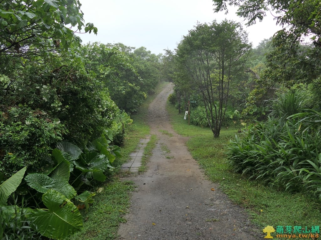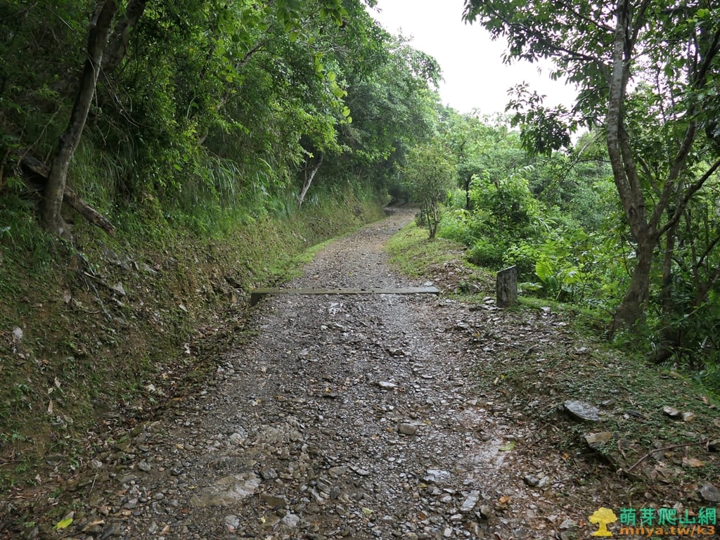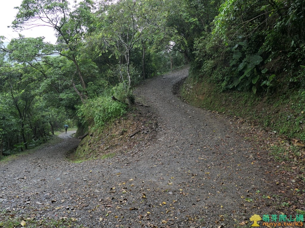 ▲步道土石路第一處大彎向左,前段爬坡較陡,午後雷陣雨下個不停,但仍遇到不少人上山。
