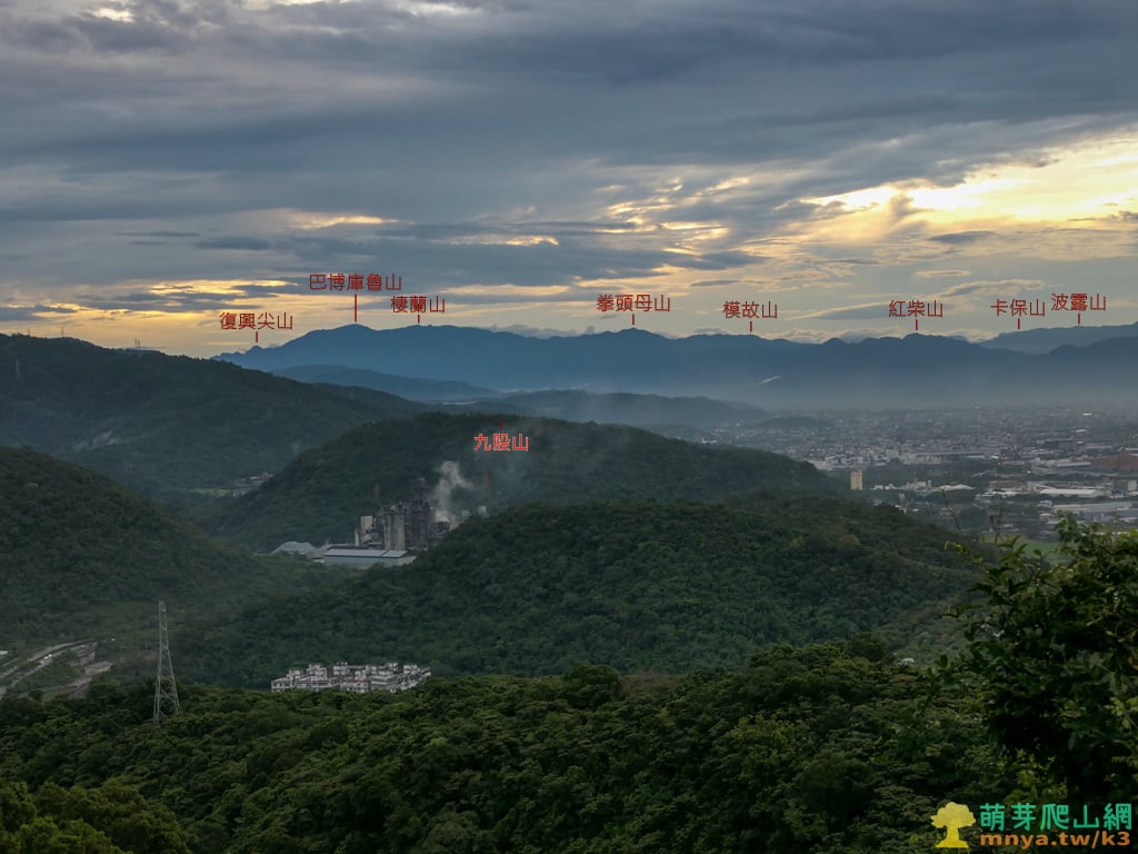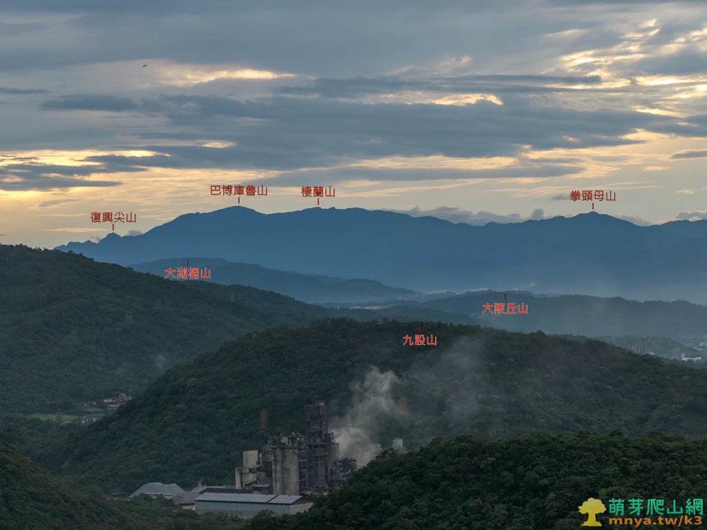 ▲往西北看九股山(170M)與山前的信大水泥廠,遠方第一層雪山山脈主稜脊上由南向北依序可見:復興尖山(1852M)、巴博庫魯山(2101M)、棲蘭山(1918M)、拳頭母山(1551M)、紅柴山(1139M),拳頭母山右後方可見烏來雙障之一的模故山(1457M),紅柴山與阿玉山連稜後方可見烏來三姑之一的波露山(1418M),波露山之後最遠可見位於新北三峽、烏來交界的卡保山(1582M)。