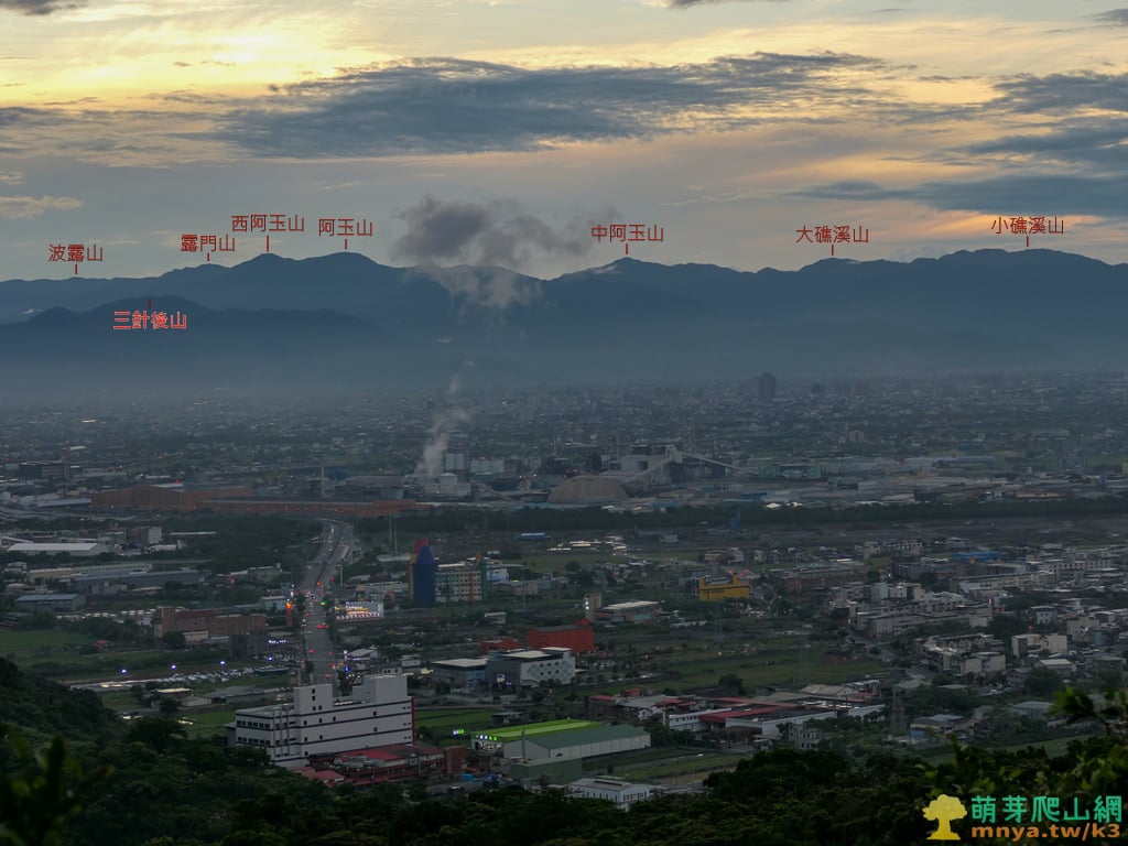 ▲往西北方眺望蘭陽平原西側與雪山山脈連峰,日落時分雲霧散開遠山變得清晰可見,下圖由視角由西北向北拉近看各個山峰。