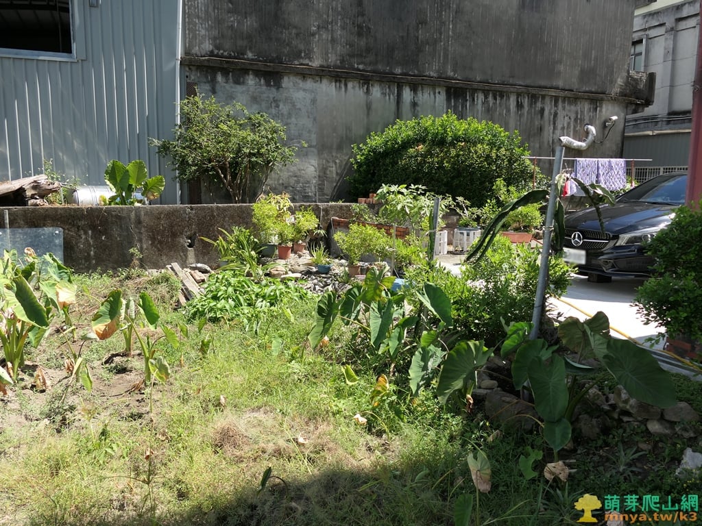 ▲基石位置全景,於屋後停車空地與花圃盆栽之間的牆角處,位置有些隱蔽難怪當初來沒找到,由於離民宅很近難免會驚動到附近居民,還得說明一番來意。