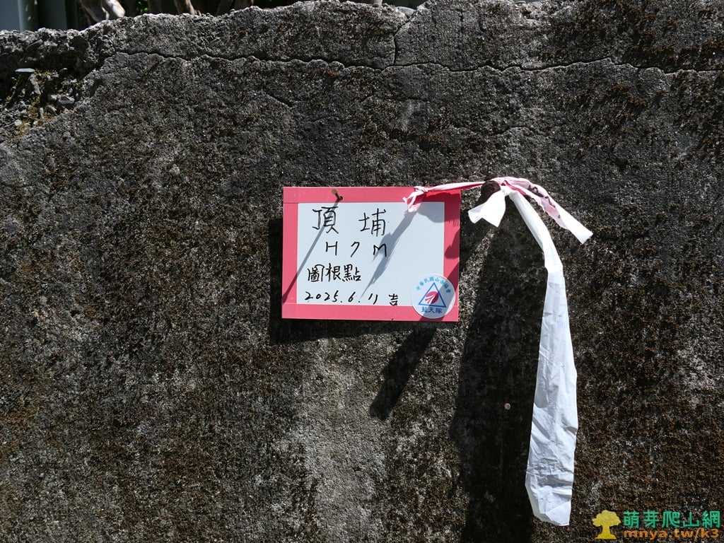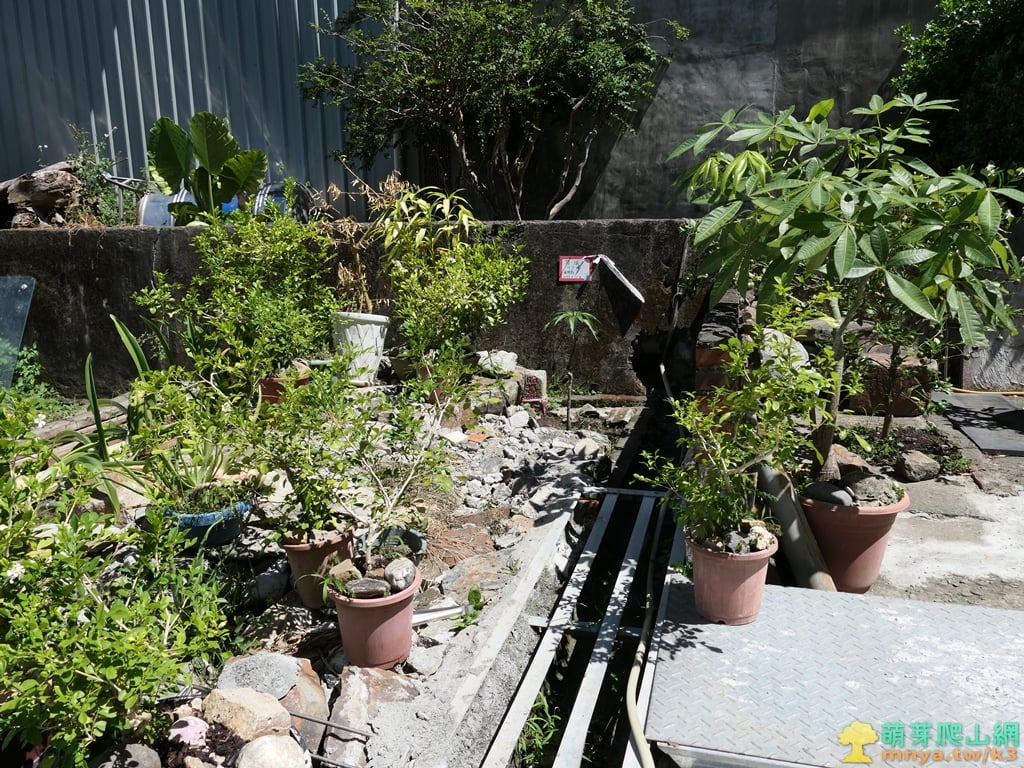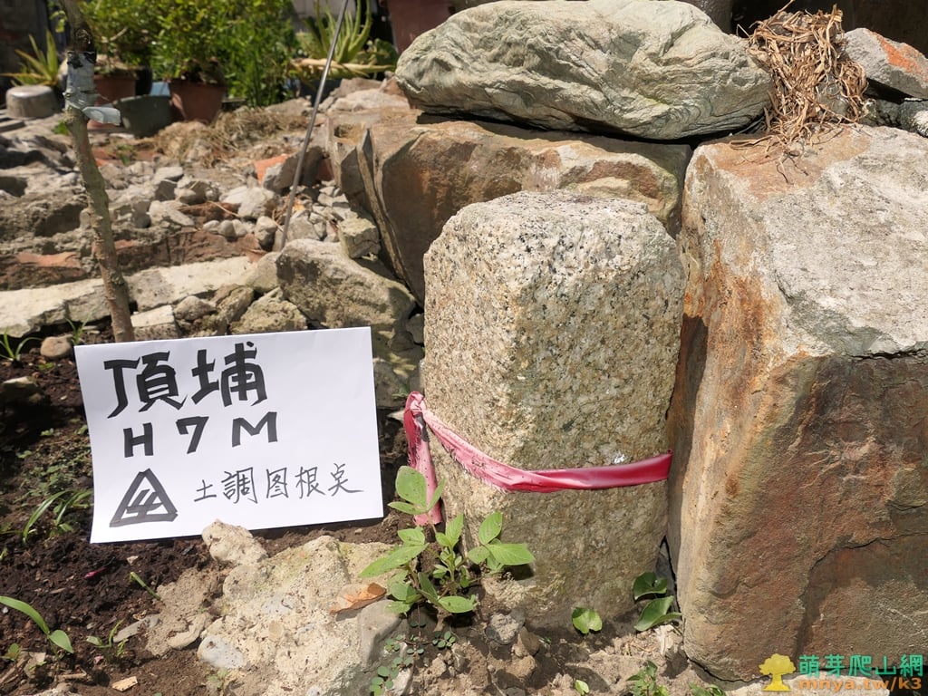 ▲往耕地邊緣牆角處行,於一堆盆栽旁的石堆間見基石,遠遠就能見到牆上的牌子,右側停車空地有小路可從頂埔社區活動中心後方進入。