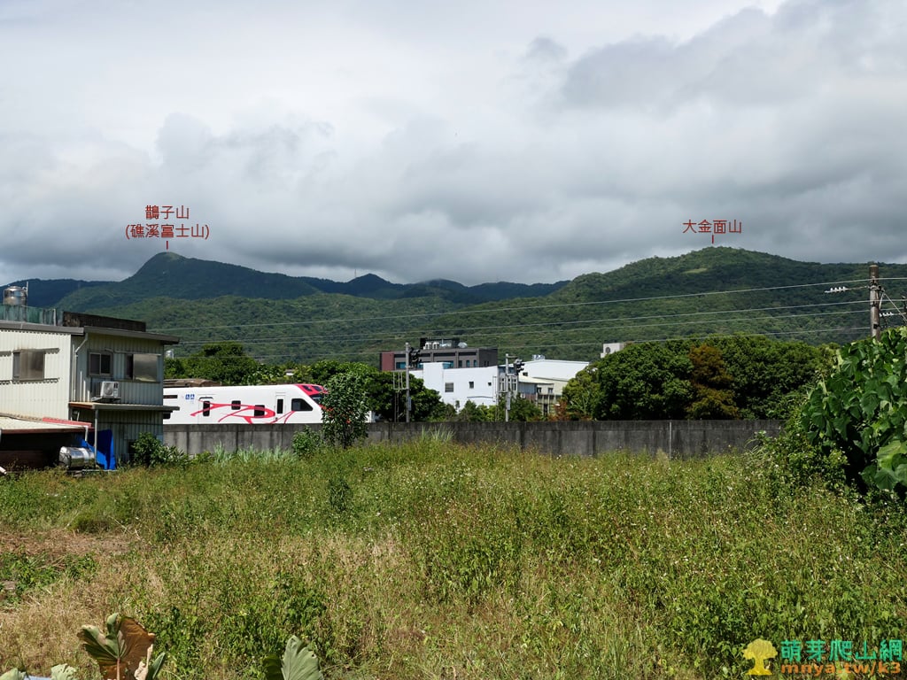 ▲民宅後的休耕地西邊就是台鐵宜蘭線,剛好一輛普悠瑪列車通過,往西可見鵲子山(礁溪富士山;679M)與台9線北宜公路旁的大金面山(416M)。