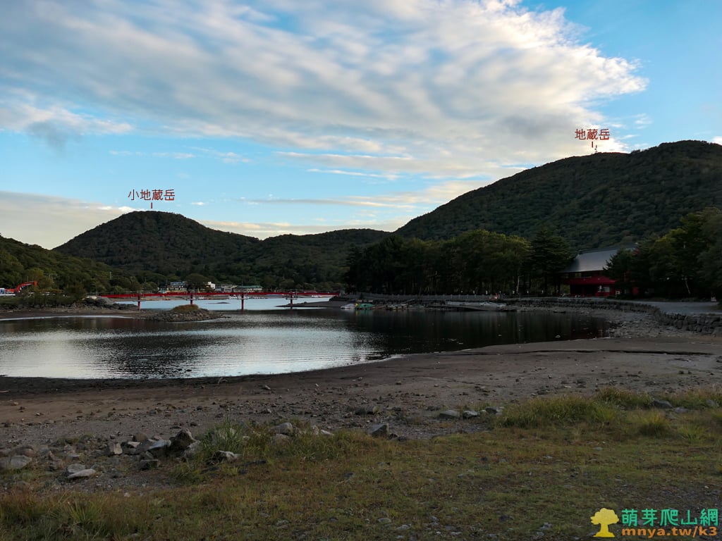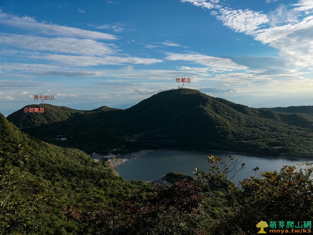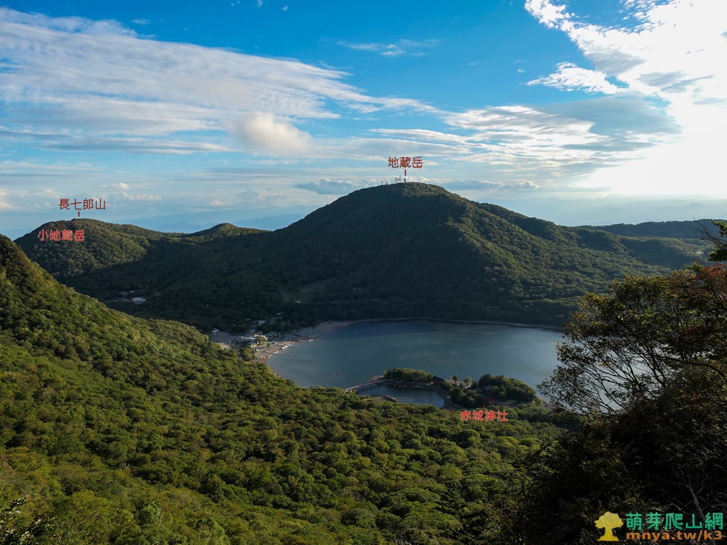 ▲稜線上俯瞰大沼、赤城神社,眺望小沼旁的小地蔵岳(1574M)、長七郎山(1579M;三等三角點),與大沼南邊的地蔵岳(1674M),下山時有著陽光的照映,湖面顯得熠熠生輝。