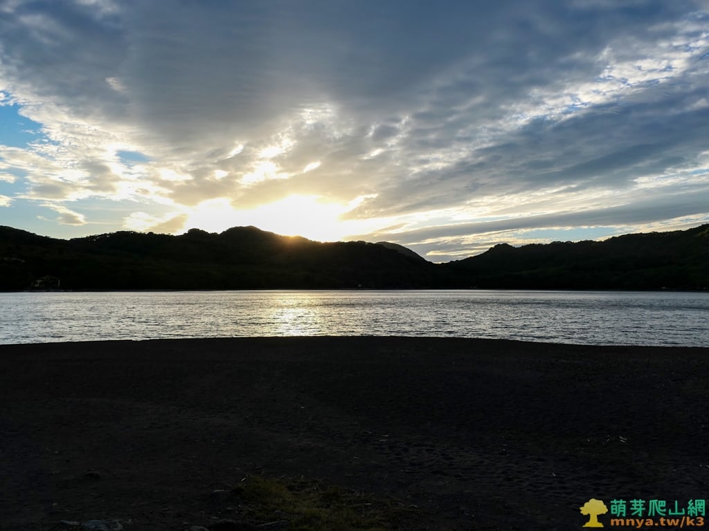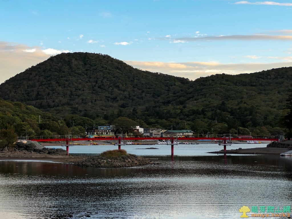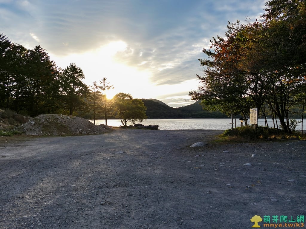 ▲走向大沼湖岸的沙地,此刻的夕陽正從西邊的鈴ヶ岳(1565M)旁透出,大沼是赤城山山頂破火山口內的火口原湖,湖周長約4公里,面積約為0.8至0.9平方公里,是赤城山山頂破火山口中面積最大的一座湖泊,最深處水深約16.5公尺。每年冬季自12月下旬至翌年4月上旬湖面會結冰,其水源除來自覚満淵的覚満川外,主要源於雨水與湖底湧泉。湖水由大沼西北端的「沼尻」處穿破火山口外輪流出,形成火口瀨,順著沼尾川向西流去,最終匯入利根川。