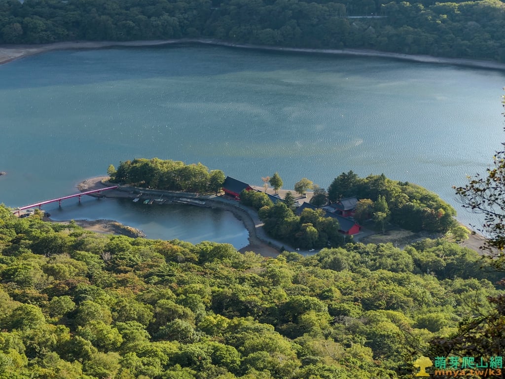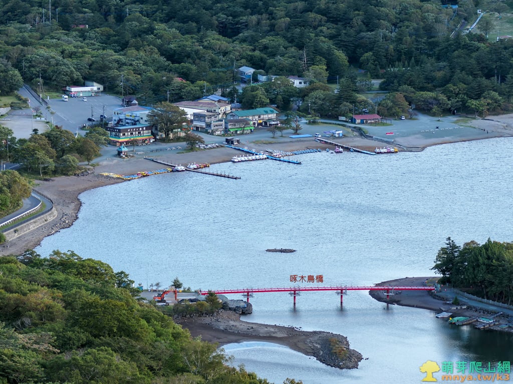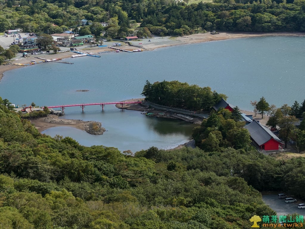 ▲拉近俯瞰大沼東側的大洞赤城神社與啄木鳥橋,及大沼南岸的おのこ駐車場、碼頭等地,居高臨下風景宜人。