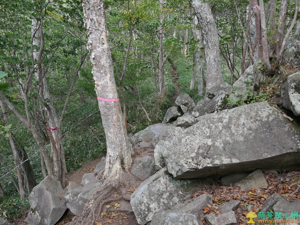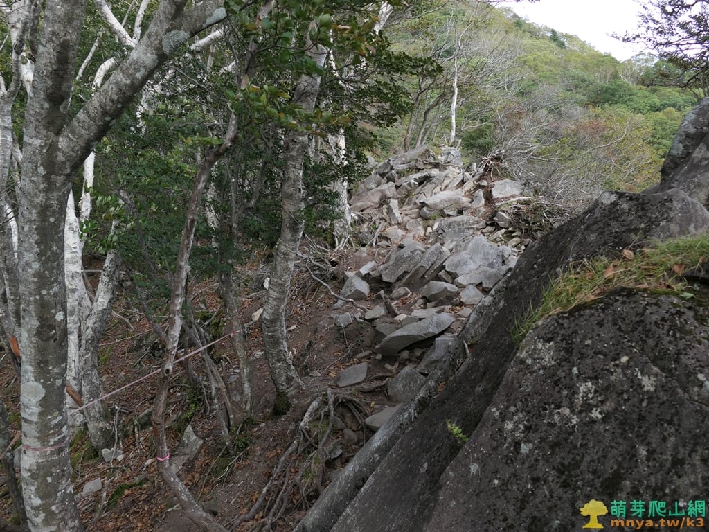 ▲過黒檜山3號防迷標誌後是一段較為平緩的山稜,靠著巨石邊繞行,路徑依舊崎嶇。