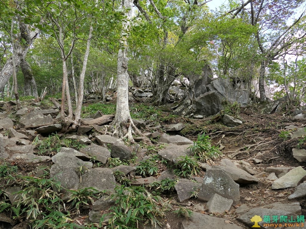 ▲順著亂石山坡直上往支稜,路徑清楚但路標不多。