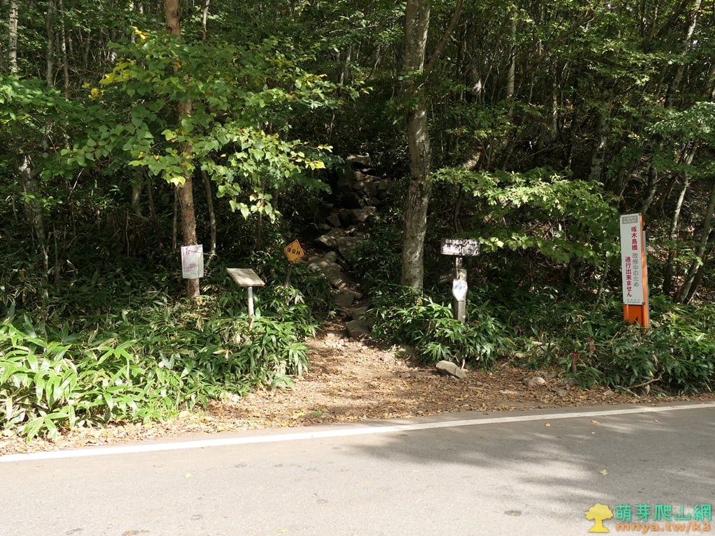▲13:58,右上進入黒檜山登山口,入口有一面「日本百名山 赤城山 最高峰 黒檜山登山口」之木牌,指標往黒桧山1.1K,及黒檜山1號防迷標誌,登山口海拔約1380公尺,至山頂的爬升近450公尺,是一條需連續陡上的路線。