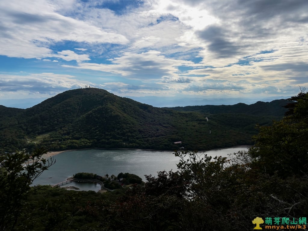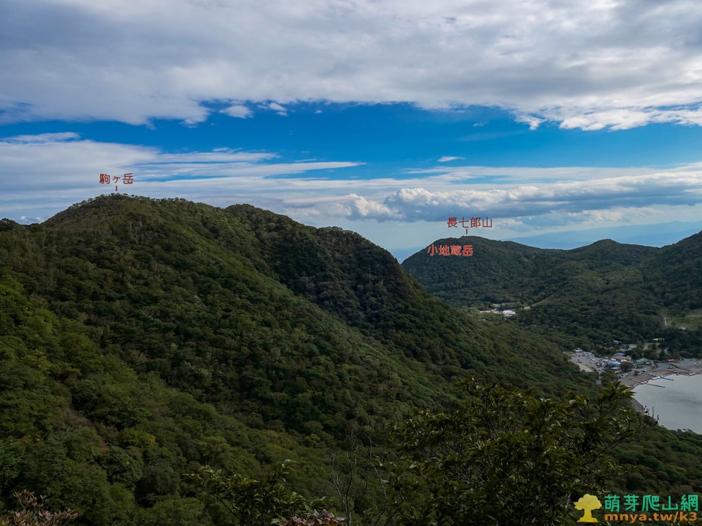 ▲黒檜山2號防迷標誌旁下山前最後一次欣賞大沼湖景,俯瞰赤城神社與大沼湖岸風光,眺望小沼旁的小地蔵岳(1574M)、長七郎山(1579M;三等三角點),與山頂建有許多基地台的地蔵岳(1674M)。