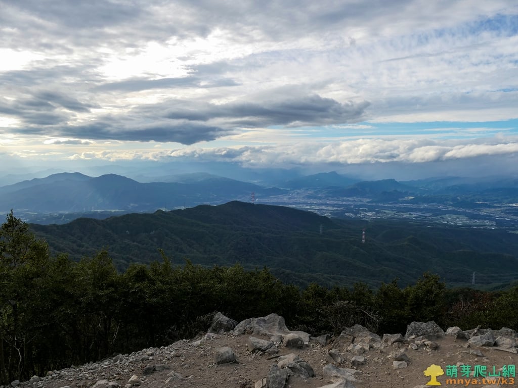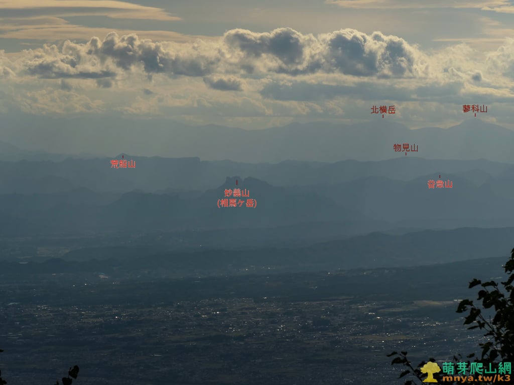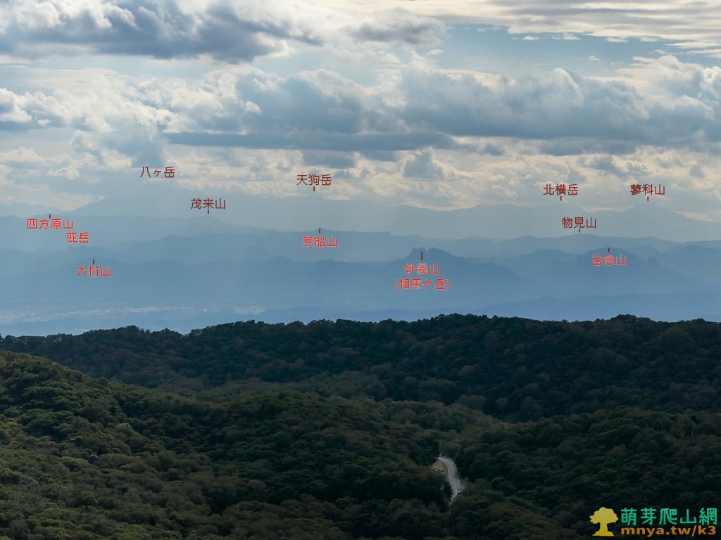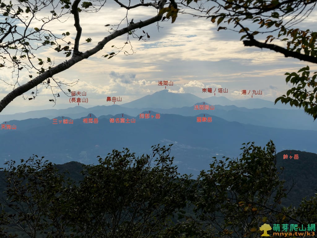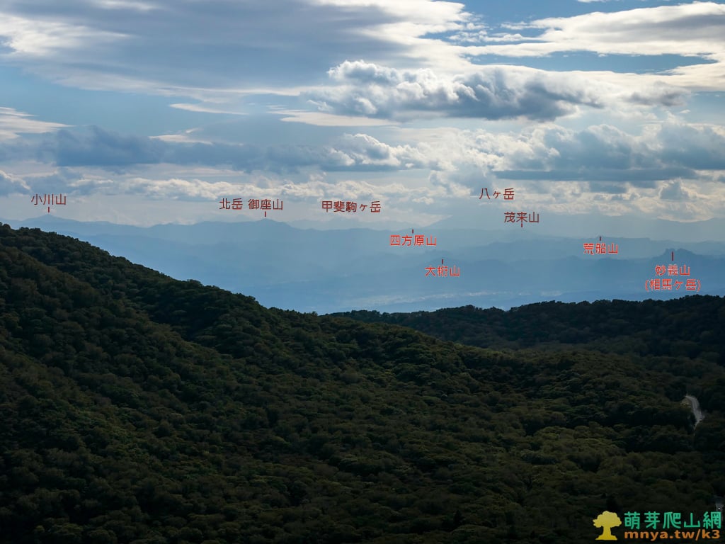▲往西南邊展望更好,可眺望赤城山第三高峰 - 地蔵岳(1674m),以及遠方甲武信ヶ岳(2475M)、妙義山等地,視野相當遼闊,用相機拉近能看見許許多多山峰,其中有數座是日本百名山。