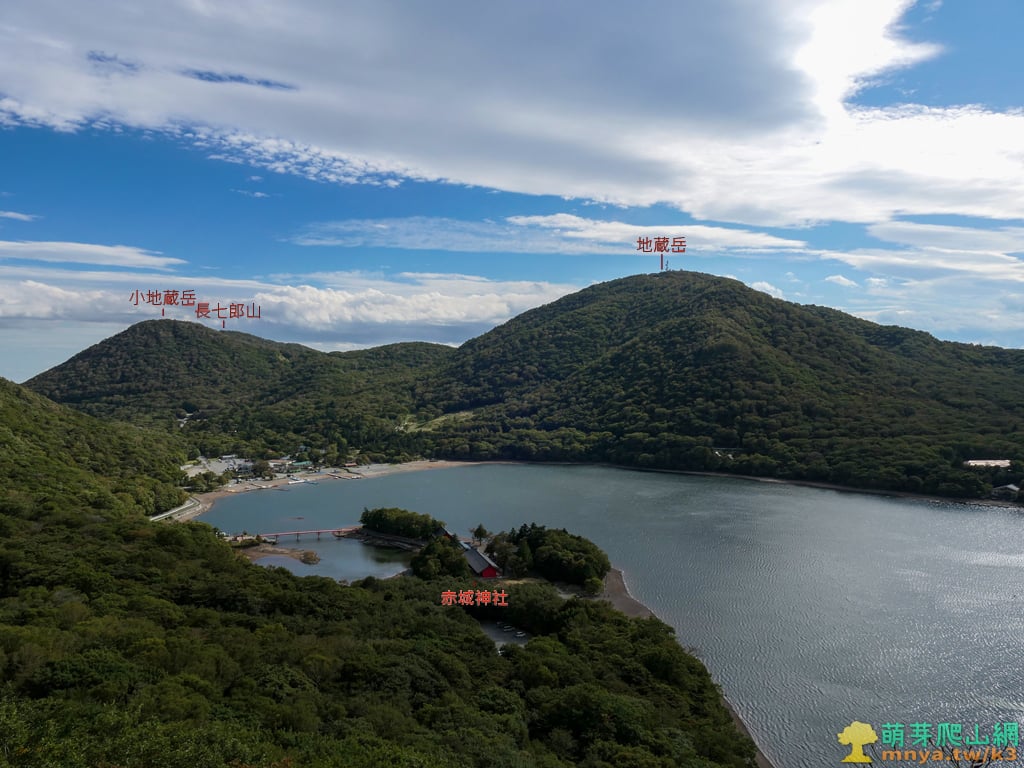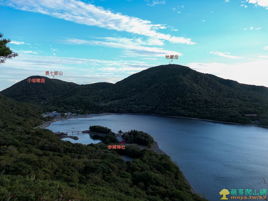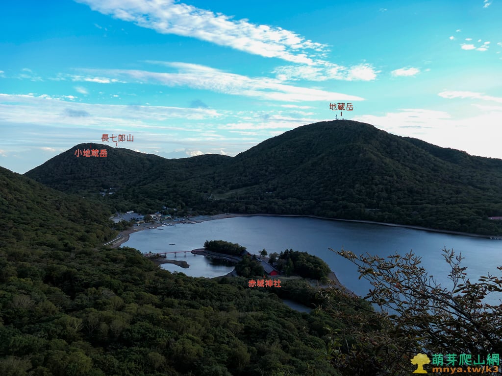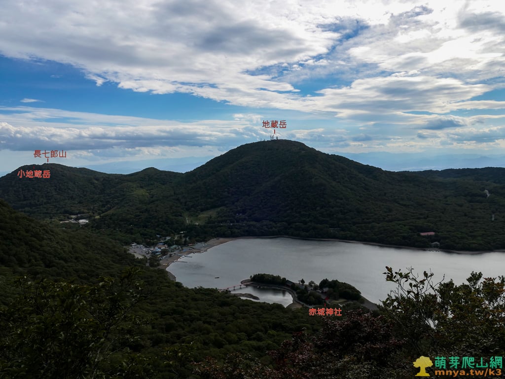 ▲俯瞰大沼與赤城神社,眺望大沼南邊、小沼周圍的小地蔵岳(1574M)、長七郎山(1579M;三等三角點)與地蔵岳(1674M),整片赤城山頂一覽無遺。